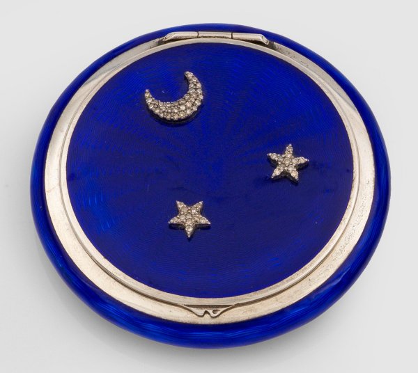 im Stil von Karl Fabergé. Silber, teilw. emailliert. Runder Korpus. Korpus tief royalblau emailliert. Auf dem Deckel zwei applizierte Sterne sowie eine zarte Mondsichel, ausgefasst mit Diamantrosen. Mit Etui. Gew. ca. 45 g. H. 1 cm. D. 5,7 cm.