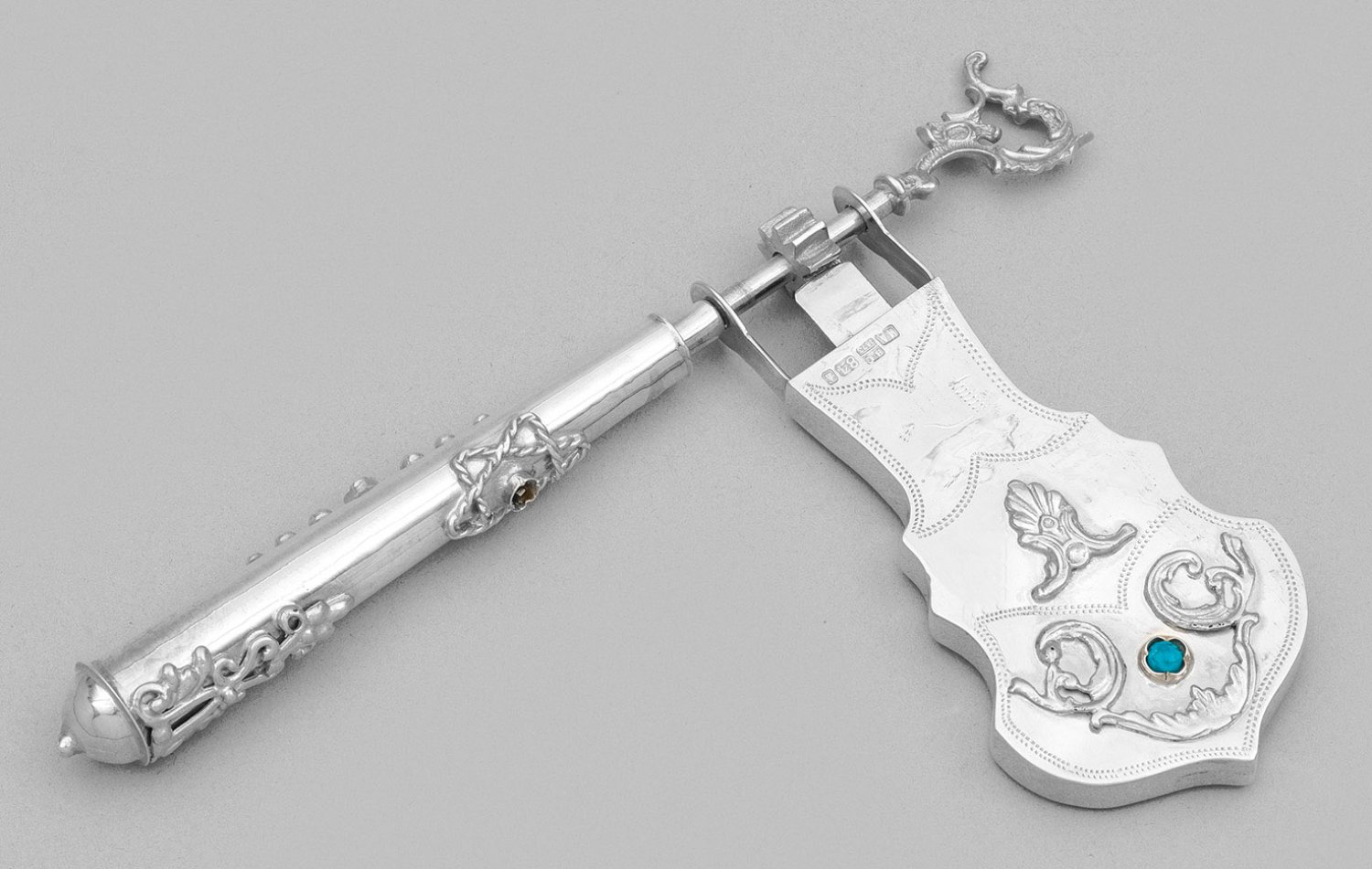 Silber. Leicht konischer Griff. Spitze aus durchbrochen gearbeiteten Rocaillen. Hohler Schwungkörper mit geschweiften Rändern. Flächen belegt mit Voluten, Rocaillen, eingesetzten roten und türkisblauen Farbsteinen sowie einem Davidsstern aus Kordelband. Schwungkörper mit doppelreihigen Zierlinien punziert. Ein Stein fehlt. Gest. 84, Beschaumeister Viktor Sawinkow, unbekannte Meistermarke, dat.; Gew. ca. 80 g. L. 17 cm.