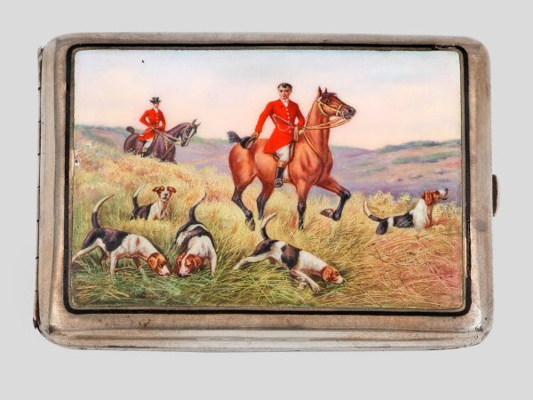 Silber, teilw. emailliert. Flache, rechteckige Grundform. Schauseitig auf Deckel formatfüllendes Emaillebild mit Jagdgesellschaft zu Pferde mit Meute. Seitlicher Drücker zum Öffnen. Innen vergoldet mit Inschrift "Weihnachten 1954 Muki". Best./ber.; Gest. 900, undeutliches Beschauzeichen. Gew. ca. 185 g. 10, 5 cm x 8 cm.