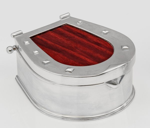 Sterlingsilber und Holz. Flacher Stand mit gering ausgestelltem Standring, übergehend in hufeisenförmigen Korpus mit glatter Wandung. Scharnierter Deckel mit Holz ausgekleidet und mit Nieten besetzt. Gest. 925, Beschauzeichen mit Herstellernummer "825". Gew. ca. 560 g. H. 5,5 cm. 13,5 cm x 11 cm.