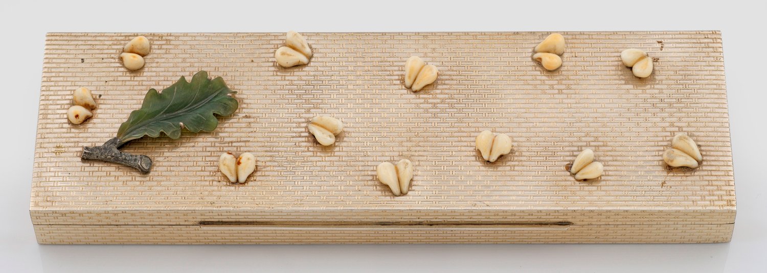 Sterlingsilber mit Holzeinsatz. Rechteckig mit flachem Scharnierdeckel und geometrisch ornamentierter Wandung. Auf den Deckel aufgelegt ein aus grünem Stein geschnittenes Eichenblatt sowie zwölf Grandeln. Gest. 925, Herstellerzeichen. Ges.-Gew. 580 g. H. 3 cm. 27,5 cm x 8,5 cm.