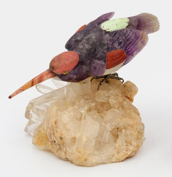 Auf einem Bergkristall sitzender, naturalistischer, vollplastisch gearbeiteter Eisvogel mit feiner Federzeichnung aus geschnittenem Halbedelsteinen, darunter wohl Amethyst. Die Augen aus Glas, die Krallen aus Metall. H. 15 cm. L. 22 cm.