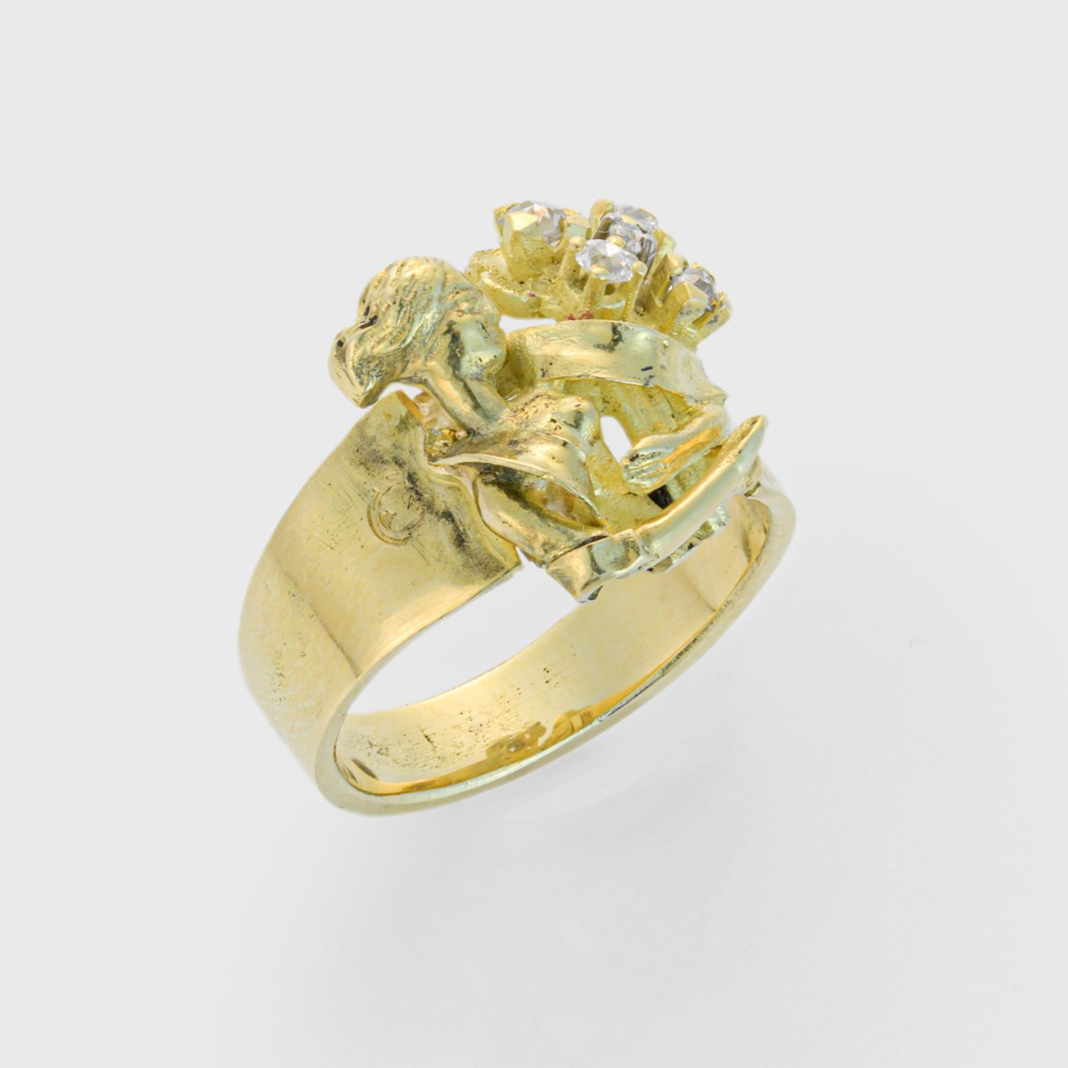 Gelbgold, 21,6 k. Ringkopf mit plastisch gestalteter, szenischer Darstellung einer jungen Frau mit Blumenstrauß, den Frühling symbolisierend, besetzt mit Diamantrosen. Herstellerzeichen. Gew. ca. 8,71 g.
