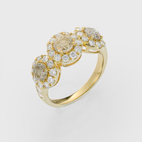 Gelbgold, gest. 750. Schauseitig besetzt mit 3 Fancy Grey Brownish-Brillanten von zus. ca. 1,45 ct., entouriert von weißen Brillanten von zus. ca. 1,00 ct. (G/vs). Gew. ca. 4,48 g.