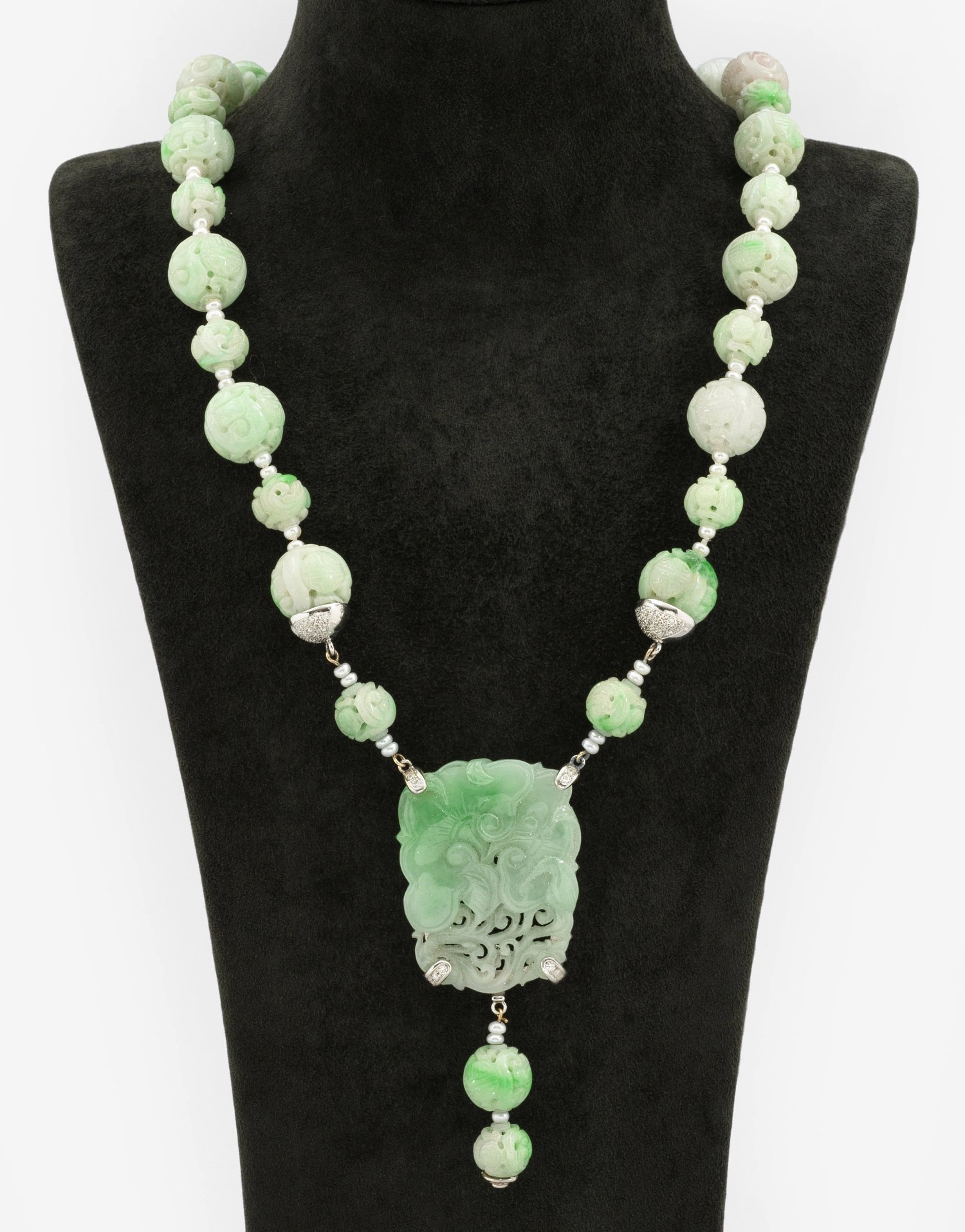 Weißgold, gest. 750. Einreihige Kette aus mintgrünen Perlen in ornamentaler Ajourarbeit, abschließender korrespondierender Anhänger mit taoistischem Glückssymbol, akzentuiert durch kleine Saatperlchen. Gew. ca. 112,96 g.