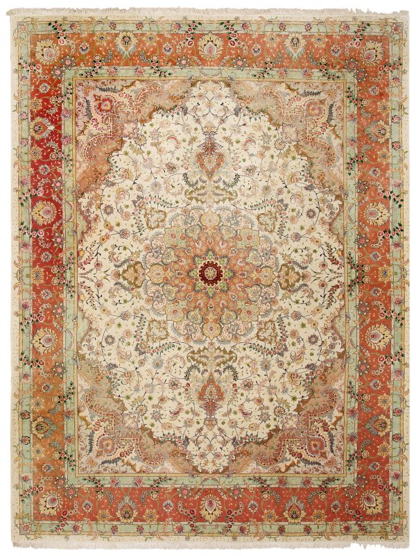 Persien. Korkwolle mit Seide auf Baumwolle. Im elfenbeinfarbenen Innenfeld großes Zentralmedaillon mit Anhängern sowie passig geschweifte Ecklösungen. Flächendeckende Musterung aus Rankenwerk. Umlaufend hellrote, korrespondierende Bordüre, begrenzt von zartgrünen Bändern. 290 cm x 395 cm.