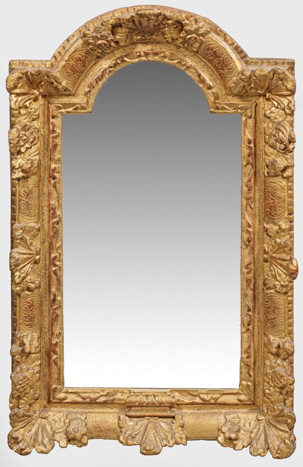 Holz, geschnitzt, gefasst und vergoldet. Hochrechteckige, profilierte Spiegelrahmung mit plastisch gestalteten Blattreserven sowie segmentförmigem oberen Abschluss. 62 cm x 39 cm.