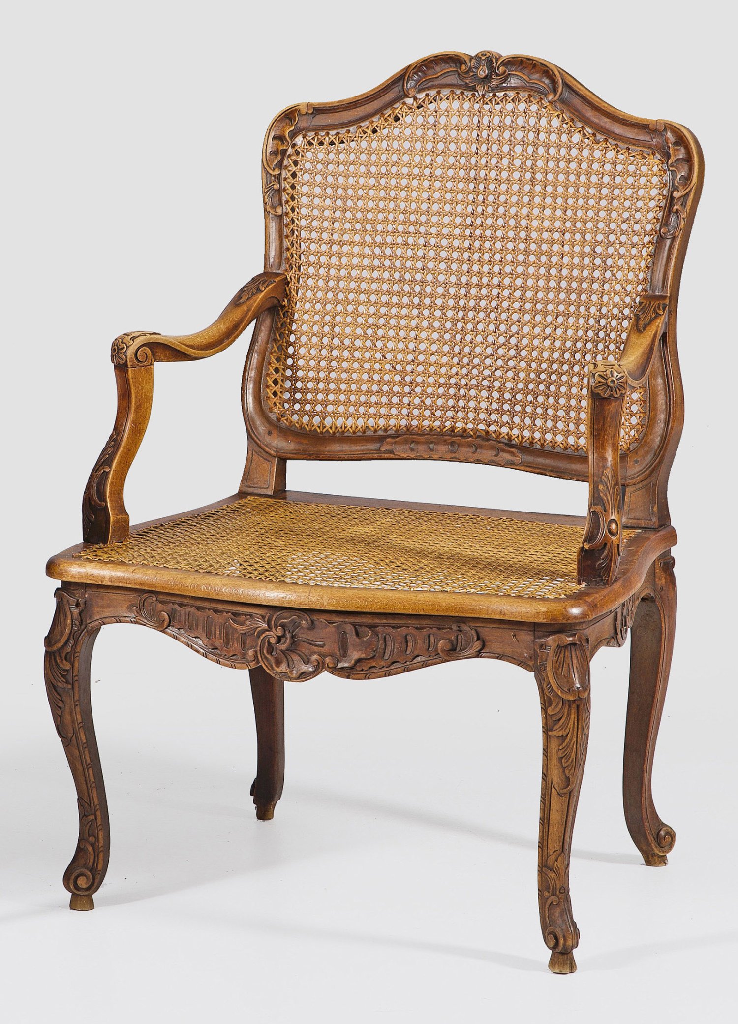 Nussbaum und Buchenholz, reliefplastisch geschnitzt. Passig geschweifte Zarge aus Rocaillen auf geschweiften Beinen. Geschweift ansteigende Stützen für schmale Armlehnen. Schildförmige Rückenlehnenrahmung. Sitz- und Lehnenfläche aus Rohrgeflecht. Sitz-H. 41 cm.