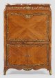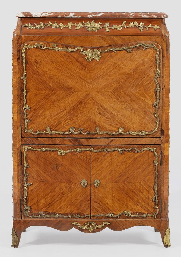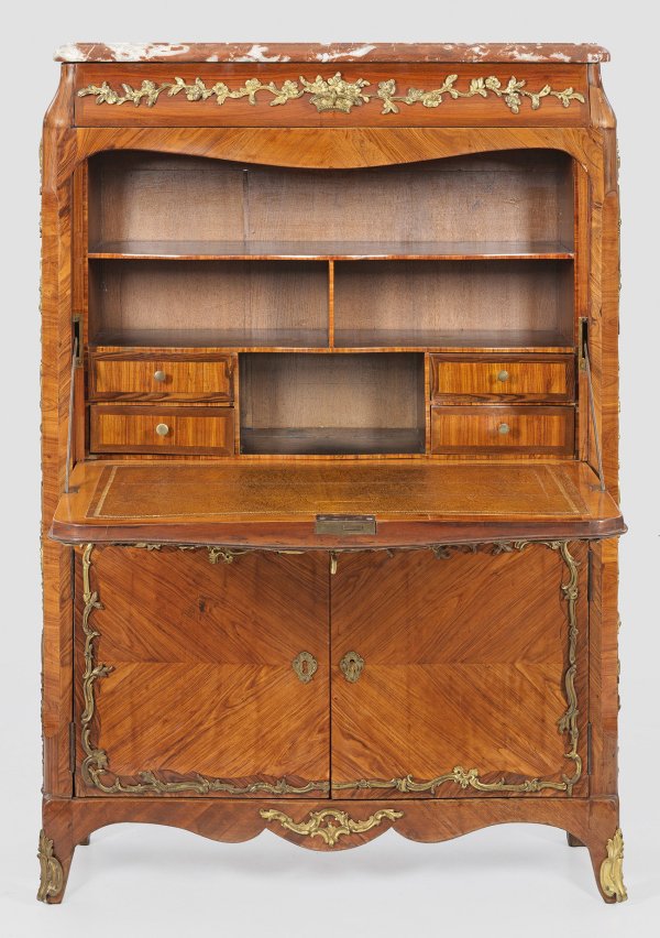 Königsholz und Rosenholz, furniert. Gerader, hochrechteckiger Korpus, flankiert von schmalen, schräggestellten Ecklisenen, in geschweifte Füße übergehend. In der gegliederten Front zwei Türen sowie abklappbare Arbeitsplatte mit eingelegter Arbeitsfläche aus goldgeprägtem Leder. Dahinter gestaffelte Facheinteilung. Geschweift ansteigender, einschübiger Abschluss sowie gering überstehende Deckplatte aus rotgemasertem Marmor. Flächendeckend gespiegelt angeordnete Furnierfelder, begrenzt von applizierten Rocaillen. Rücks. Schlagstempel-Sign.; L. BOUDIN (wird Meister 1761) sowie Pariser Jury-Stempel JME. H. 138 cm. 91,5 cm x 36 cm.