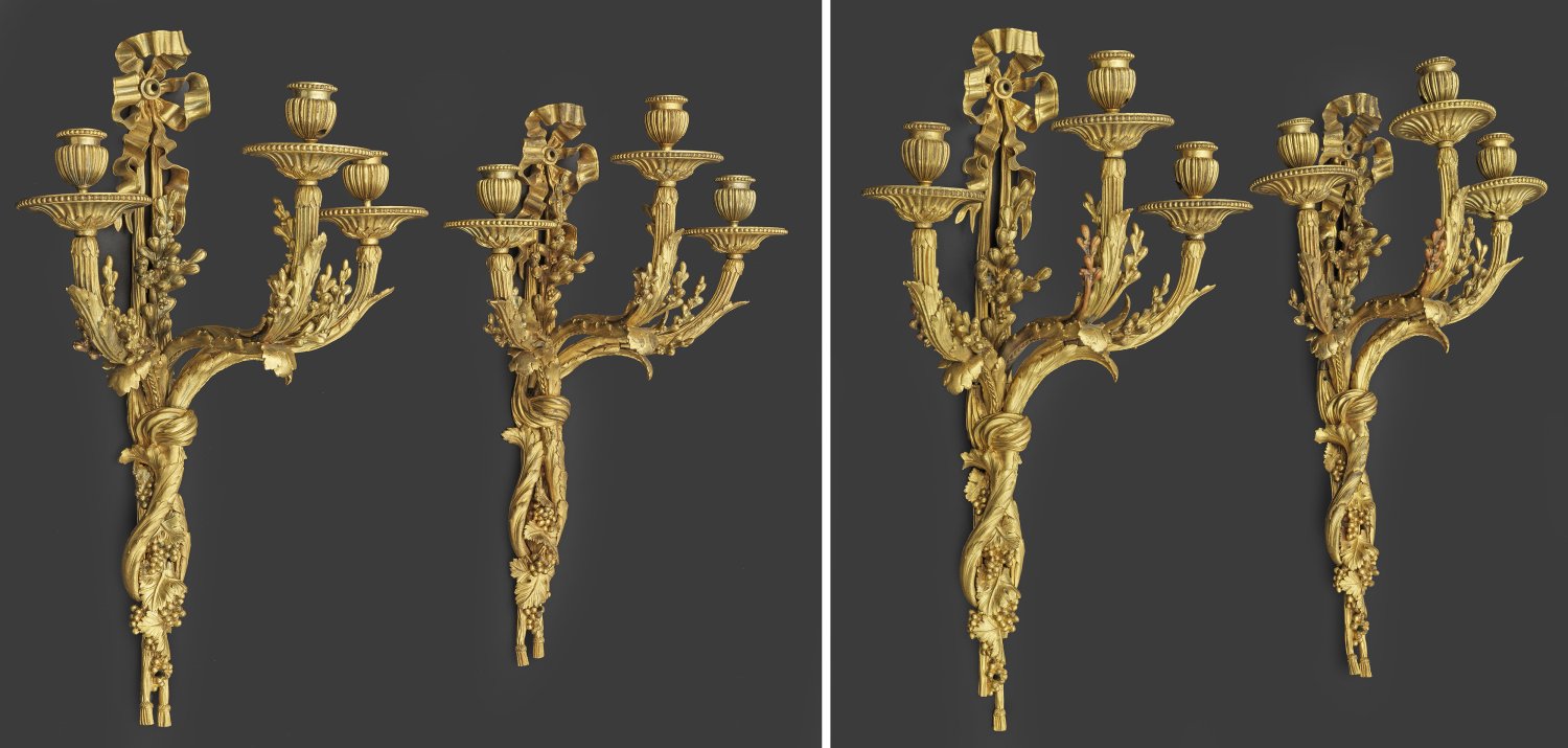 3-flg.; Bronze, fein ziseliert und vergoldet. Schlankes, gestrecktes Wandschild aus Draperiewerk mit großer Schleifenbekrönung und plastischen Weinreben. Davon ausgehend stark geschwungene, godronierte Leuchterarme aus üppigem Blattwerk mit vasenförmigen Tüllen über kannelierten Traufschalen mit Perlstabfries. Bohrung für Elektrifizierung. Unw. besch.; H. 64 cm.
