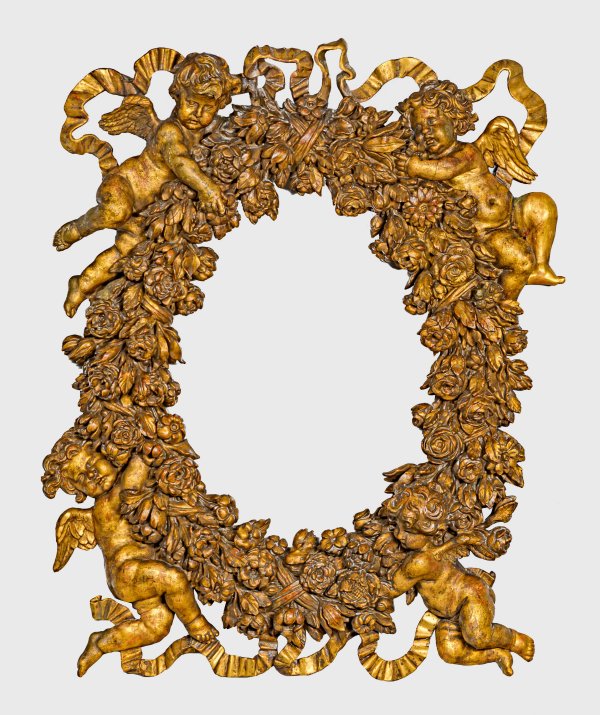 Holz, reliefplastisch geschnitzt und vergoldet. Hochovale Rahmung mit flächendeckendem Dekor aus plastisch gearbeiteten Rosenblüten und Schleifenmotiven, umgeben von vollplastisch gestalteten Puttenkindern. Erg.; 114 cm x 94 cm.