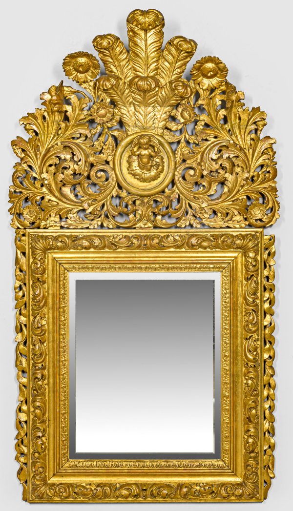 Holz, geschnitzt, gefasst und vergoldet. Hochrechteckige, breit profilierte Rahmung aus reliefiertem Blattwerk. Oberhalb hohe, durchbrochen gearbeitete Bekrönung aus üppigen, dicht angeordneten Blattvoluten mit zentralem Puttentondo sowie vorkragender Federbekrönung. Facettiertes Spiegelglas. 158 cm x 88 cm.