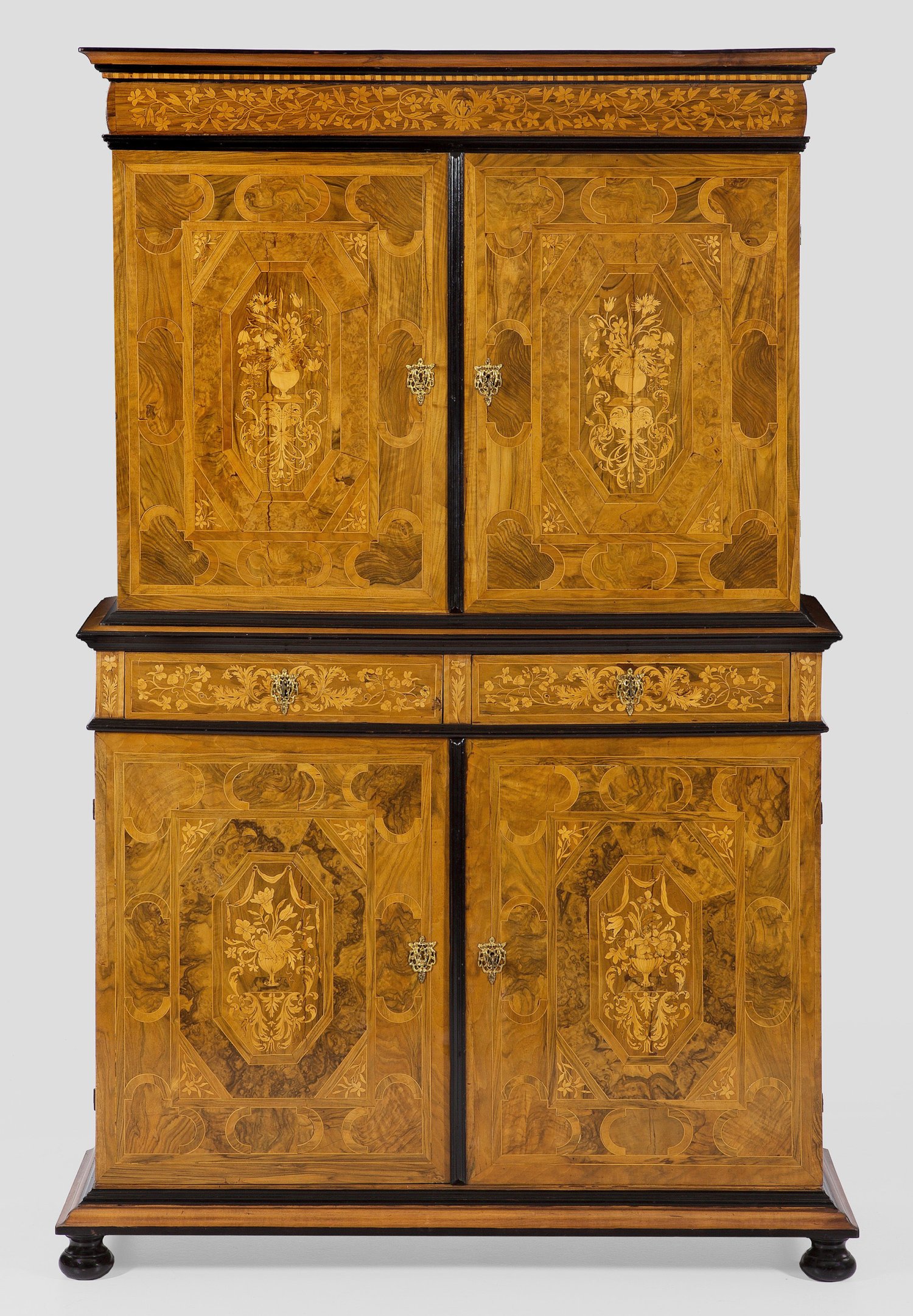 Nussbaum, furniert und teilw. ebonisiert sowie aufwändige Einlagen aus Ahorn. Gerader, querrechteckig angelegter Korpus auf breiter Profilzarge und gedrückten Balusterfüßen. In der gegliederten Front zwei große Türen sowie zwei Schubfächer. Oberhalb korrespondierender Aufsatz mit umlaufendem Profilgesims. Flächendeckend breit gerahmte Furnierfelder, von Band- und Fadeneinlagen begrenzt sowie in der Front detailreich gestaltete Einlagen aus blütengefüllten Vasen, Blattvoluten und Draperiewerk. Rest.; Beiliegend Expertise von Eugène Brelaz (in Kopie). H. 205 cm. 130 cm x 52 cm.
