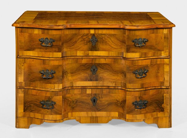 Nussbaum, furniert. Gerader, querrechteckig angelegter Korpus mit ausgebogter Zarge auf entsprechenden Füßen. In der gegliederten Front drei breite, gegenläufig geschweifte Schubladen. Gering überstehende, profilierte Deckplatte. Flächendeckend breit gerahmte Furnierfelder. Erg.; In der Schublade Etikett M 217. H. 81 cm. 121 cm x 64,5 cm.