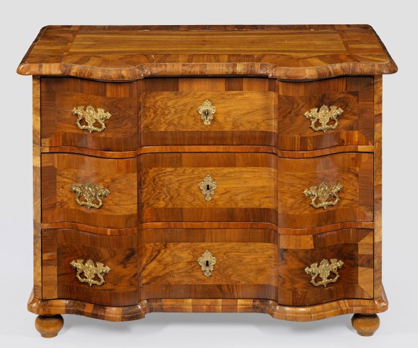 Nussbaum, furniert. Gerader Korpus auf schmaler Zarge und gedrückten Füßen. In der gegliederten Front drei gegenläufig geschweifte Schubladen. Korrespondierende, gering überstehende Deckplatte. Flächendeckend breit gerahmte Furnierfelder. Erg.; Altersspuren. H. 79,5 cm.105 cm x 61 cm.