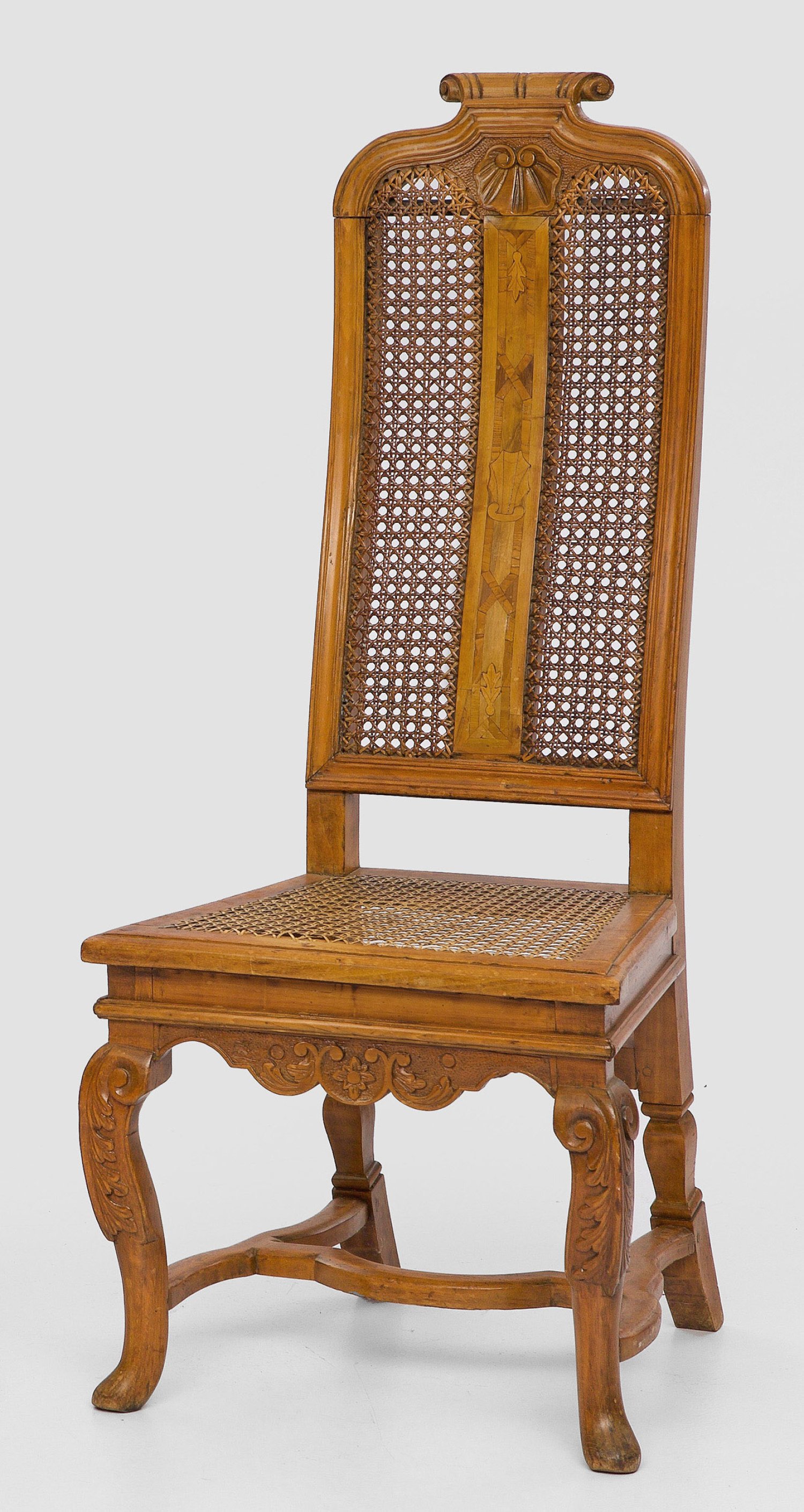 Nussbaum, massiv und furniert sowie Einlagen aus Eschenholz. Trapezförmige Zarge auf volutenförmigen Beinen, durch geschweifte Stege verbunden. Hohe Rückenlehnenrahmung mit eingerolltem oberen Abschluss. Sitz- und Lehnenfläche aus Rohrgeflecht. Sitz-H. 45 cm.