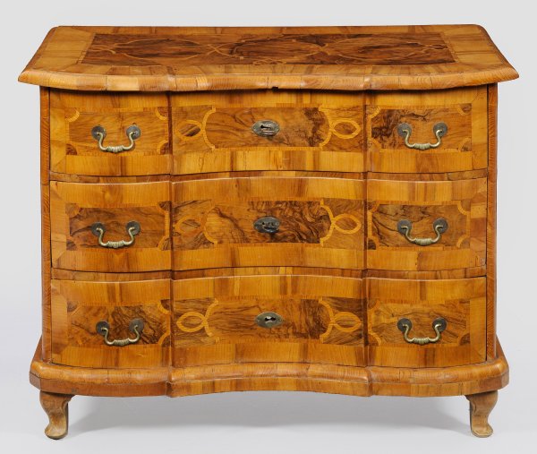 Nussbaum, furniert sowie Einlagen aus Eschenholz. Gerader, querrechteckig angelegter Korpus auf gewulsteter Zarge und kurzen Volutenfüßen. In der gegliederten Front drei breite, geschweifte Schubladen. Gering überstehende Deckplatte. Flächendeckend breite gerahmte Furnierfelder, von Bandeinlagen begrenzt. H. 82,5 cm. 107 cm x 60 cm.
