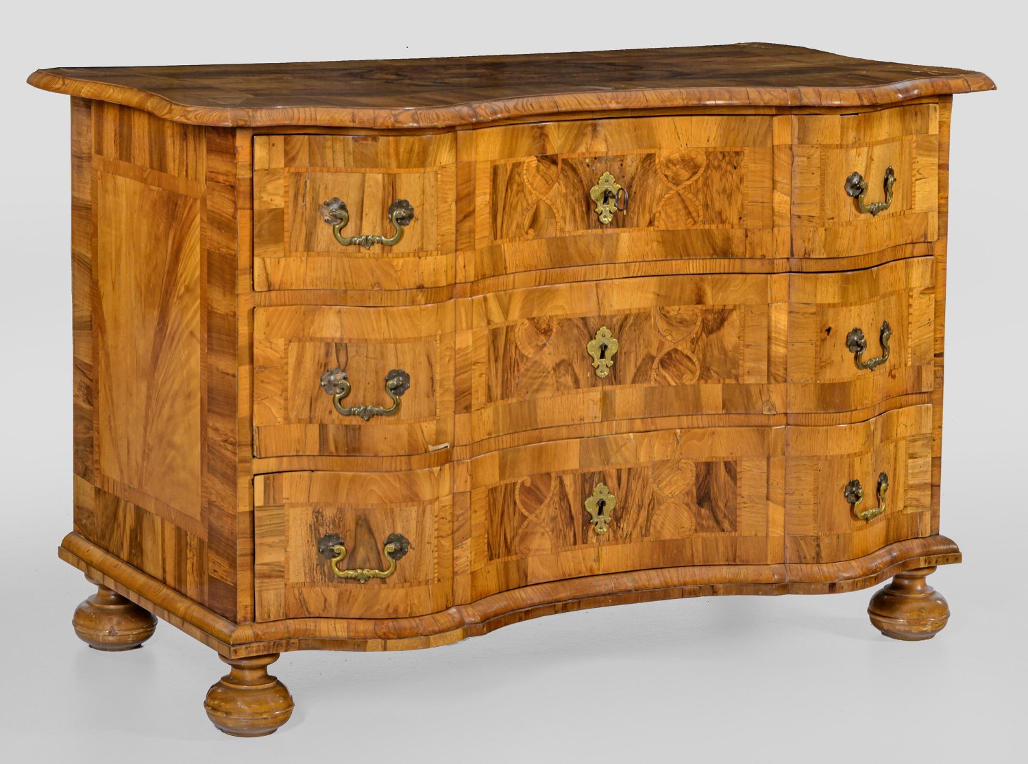 Nussbaum, furniert sowie Einlagen aus Eschenholz. Gerader, querrechteckig angelegter Korpus auf gewulsteter Zarge und Balusterfüßen. In der gegliederten Front drei breite, gegenläufig geschweifte Schubladen. Passig geschweifte, gering überstehende Deckplatte. Flächendeckend breit gerahmte Furnierfelder. H. 78,5 cm. 123 cm x 63,5 cm.