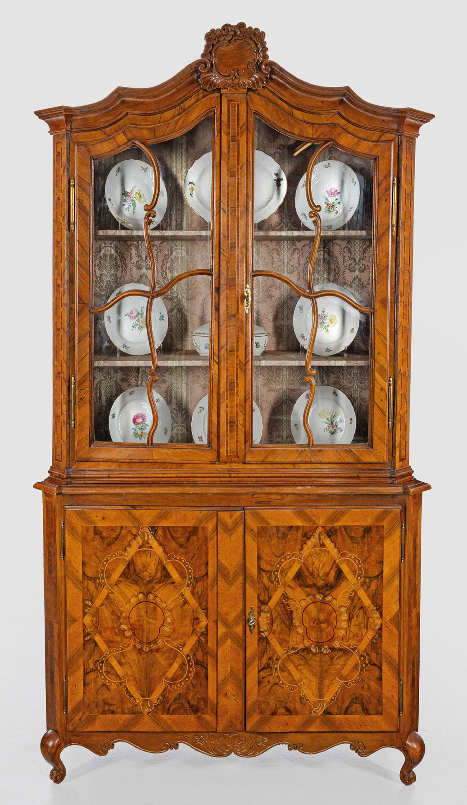 Nussbaum, furniert und teilw. farbig bemalt sowie Einlagen aus Pflaumenholz. Gerader, querrechteckig angelegter Korpus auf passig geschweifter Zarge und Volutenfüßen. In der gegliederten Front zwei Türen, flankiert von schräggestellten Ecklisenen mit Rautenmotiven. Oberhalb zweitürig sprossenverglaster Vitrinenaufsatz. Geschweift ansteigendes Profilgesims mit Kartuschenbekrönung. Seitlich Furnierfelder aus Gitterwerk. H. 204 cm. 113 cm x 51 cm.