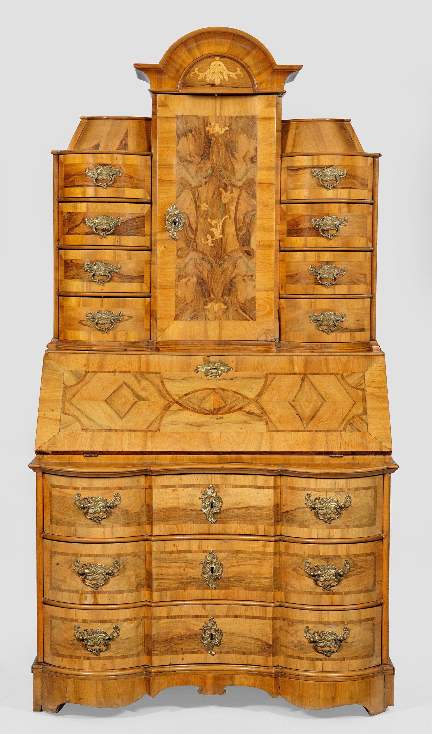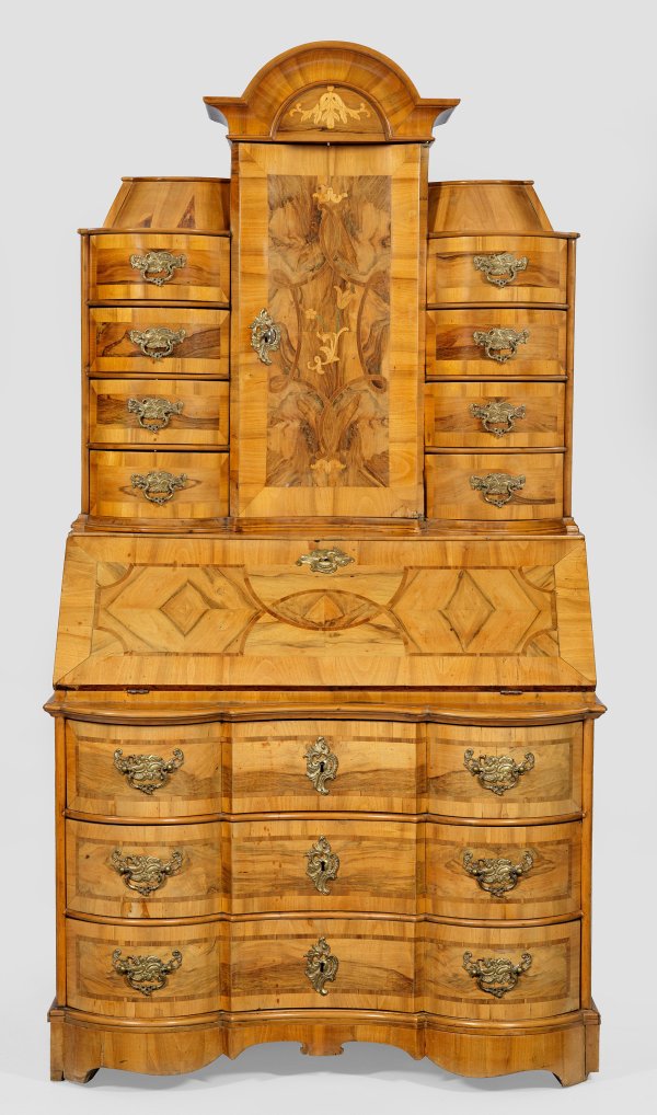 Nussbaum, teilw. auf Eichenholz, furniert. Gerader Korpus auf breitem Zargensockel. In der gegliederten Front drei gegenläufig geschweifte Schubladen sowie schräggestellte, abklappbare Arbeitsfläche. Oberhalb korrespondierender Aufsatz mit zentraler Tabernakeltür, flankiert von Schubfächern. Flächendeckend breite gerahmte Furnierfelder, von Bandeinlagen begrenzt. H. 192 cm x 104 cm x 67 cm.