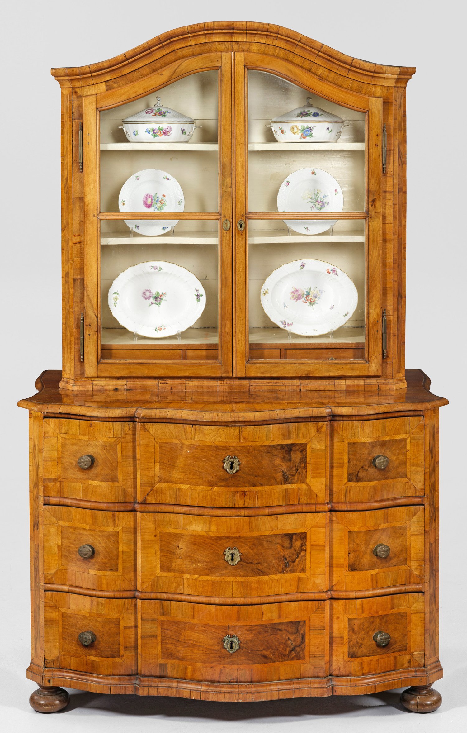 Nussbaum, furniert. Passig geschweifter Korpus auf schmaler Profilzarge und gedrückten Füßen. In der gegliederten Front drei gegenläufig geschweifte Schubladen. Entsprechende, gering überstehende Deckplatte. Weit zurückgesetzter, zweitürig verglaster Aufsatz mit geschweift ansteigendem Profilgesims. Flächendeckend breit gerahmte Furnierfelder, von Bandeinlagen begrenzt. H. 205 cm. 129 cm x 74 cm.