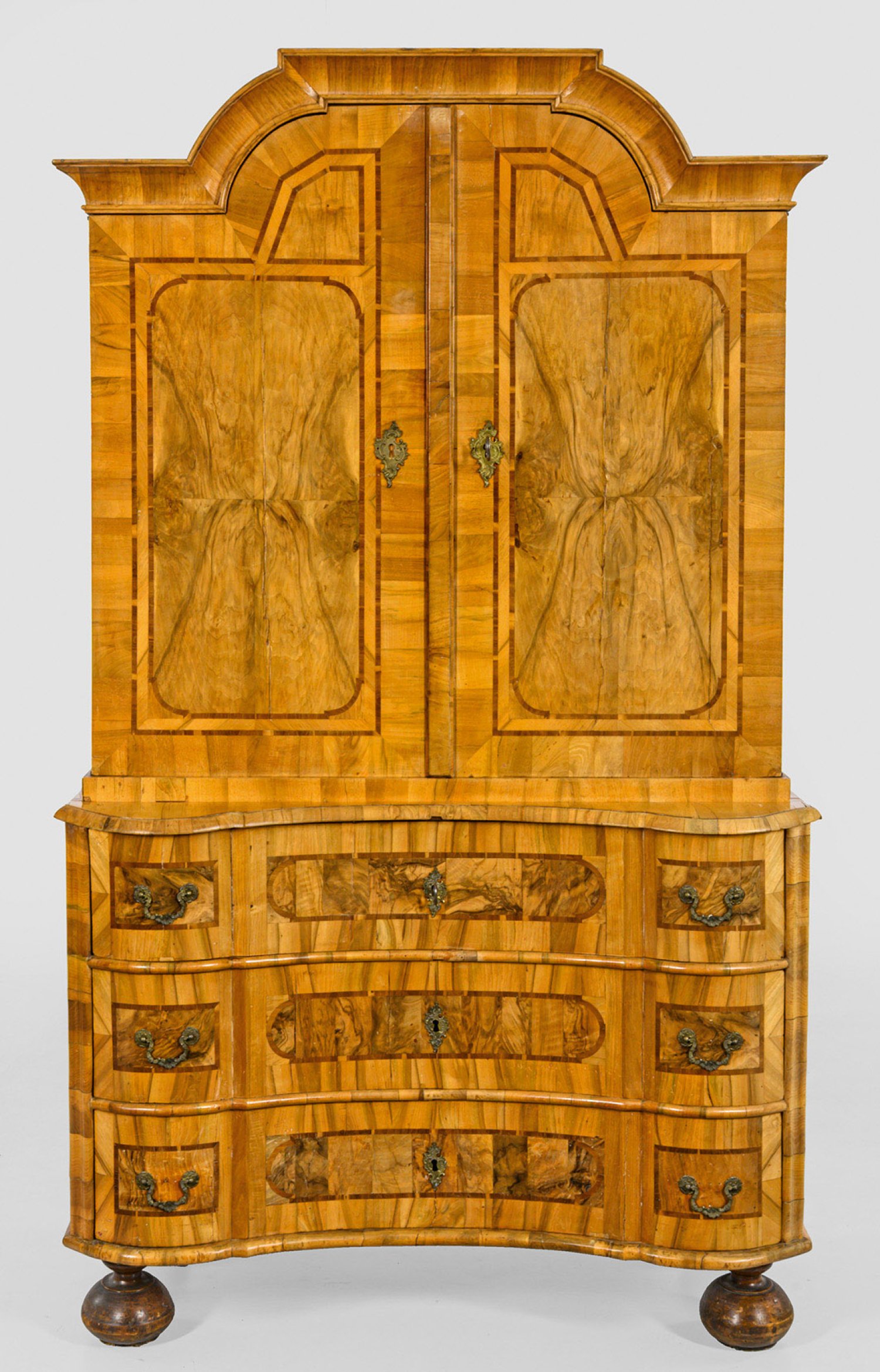 Nussbaum, furniert sowie Einlagen aus Pflaumenholz. Gerader, querrechteckig angelegter Korpus auf schmaler Zarge und hohen Kugelfüßen. In der gegliederten Front drei breite, gegenläufig geschweifte Schubladen. Gering überstehende, profilierte Deckplatte. Zurückgesetzter, zweitüriger Aufsatz mit mittig aufgeworfenem Kehlgesims. Inneneinteilung aus Ablageflächen, kleiner Tür und Schubfächern. Flächendeckend breit gerahmte Furnierfelder. H. 210 cm. 127 cm x 57,5 cm.