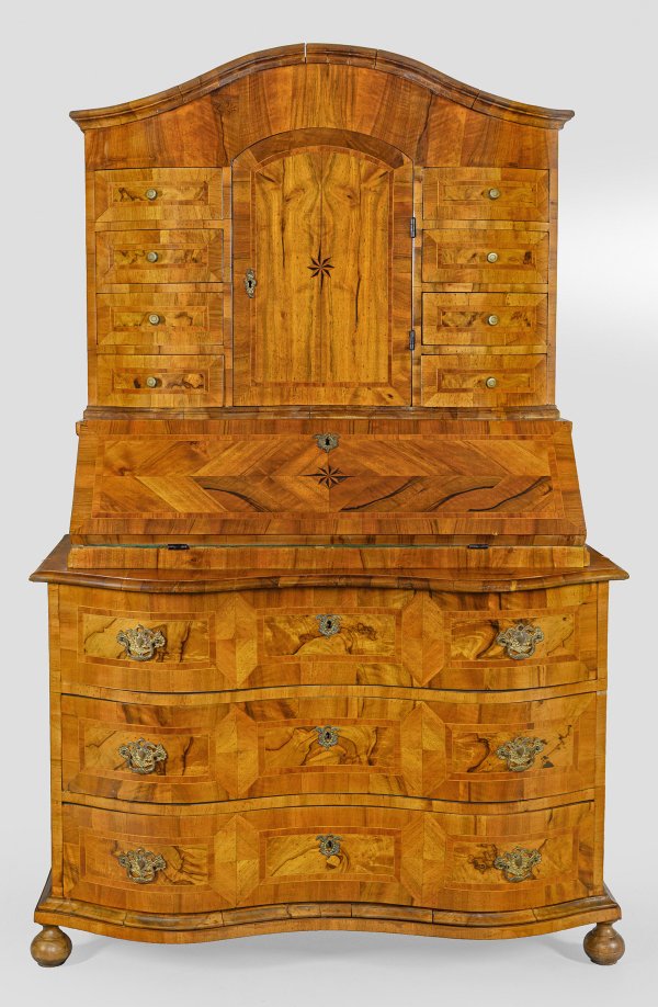 Nussbaum, furniert. Gerader, querrechteckig angelegter Korpus auf schmaler Zarge und gedrückten Füßen. In der gegliederten Front drei breite, doppelt geschweifte Schubladen. Gering überstehende Deckplatte als Auflage für schräggestellte, abklappbare Arbeitsfläche. Dahinter Facheinteilung. Oberhalb korrespondierender Aufsatz mit zentraler Tabernakeltür, flankiert von Schubfächern. Flächendeckend breit gerahmte Furnierfelder mit Faltsternen, von Bandeinlagen begrenzt. Rest mit Erg.; H. 195 cm. 128 cm x 64 cm.