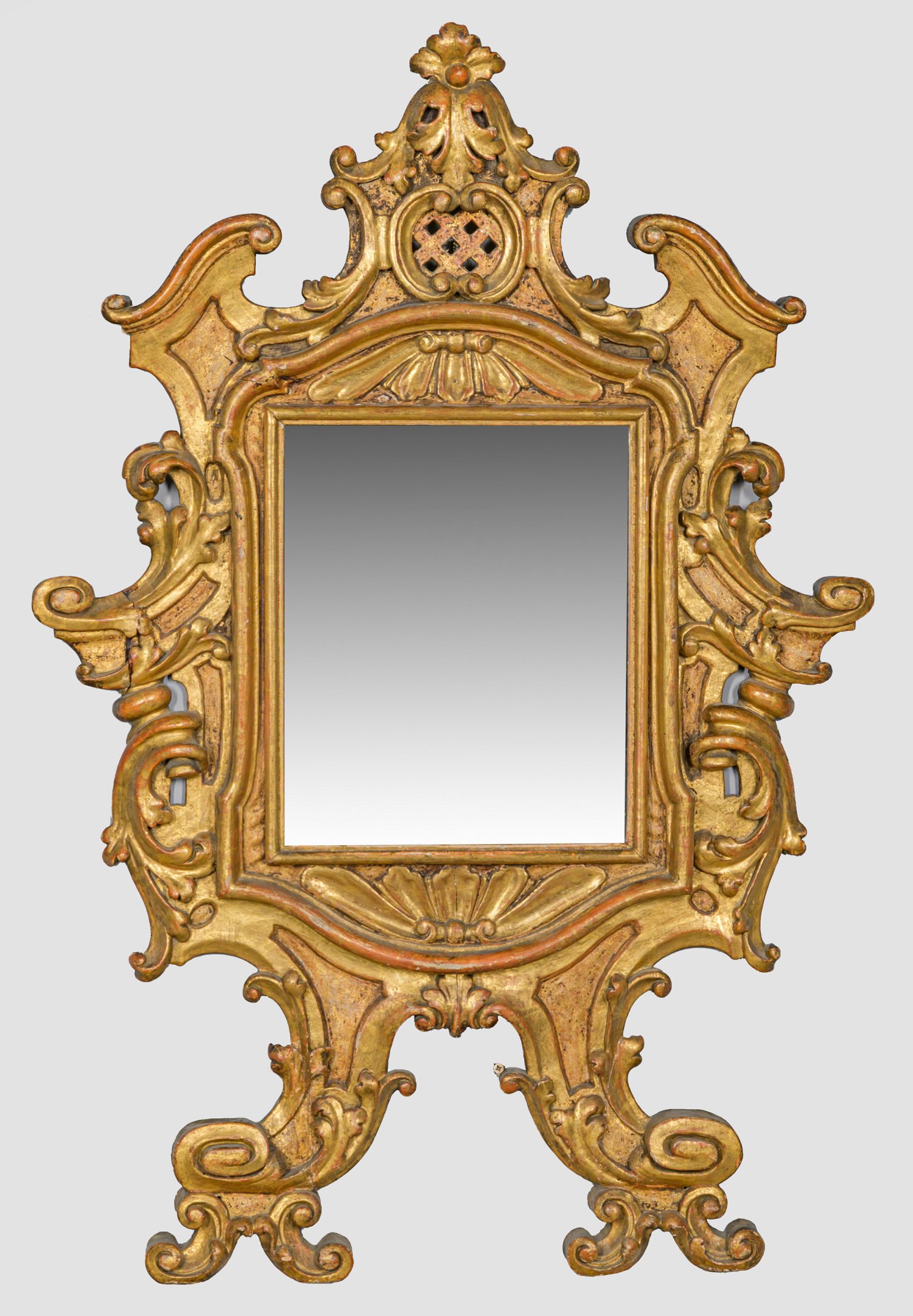 Holz, geschnitzt, gefasst und vergoldet. In erhaben angelegter Kartusche auf Volutenfüßen rechteckige, profilierte Spiegelrahmung, umgeben von üppigen, plastisch gestalteten Volutenmotiven und Blattwerk. Durchbrochen gearbeiteter oberer Abschluss mit Gitterwerk. 94 cm x 63 cm.