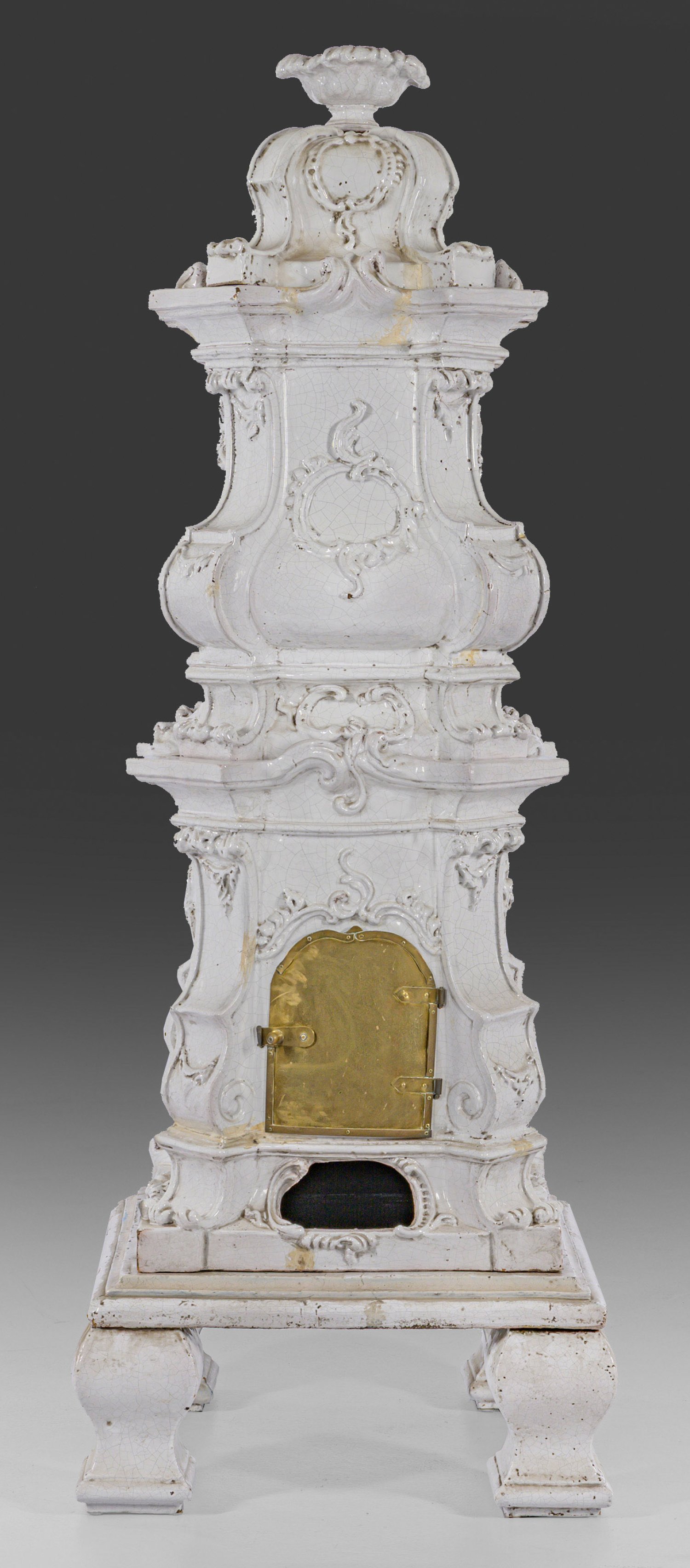 Cremefarben glasierte Keramik. Über quadratischer Sockelplatte balusterförmiger Korpus, flankiert von breiten, schräggestellten Ecklisenen aus eingerollten Voluten auf gekanteten Balusterfüßen. Allseitig Dekor aus erhaben reliefierten Rocaillereserven. Geschweift ansteigender oberer Abschluss. H. 193 cm.