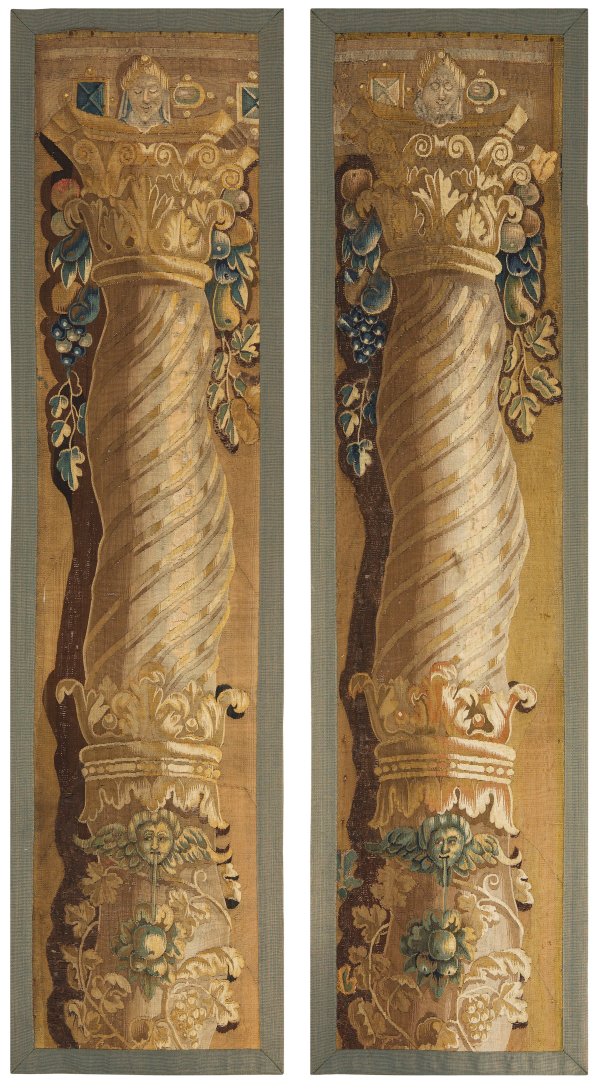 Wolle in unterschiedlichen Braun-, Beige-, Blau- und Grüntönen, flach gewebt. Umlaufend erg. schmale Rahmung. Jeweils flächendeckende Darstellung einer großen, in sich gedrehten Balustersäule mit von Blattwerk umwundener Basis sowie korinthischem Kapitell, flankiert von Frucht. Erg.; 205 cm x 54 cm.