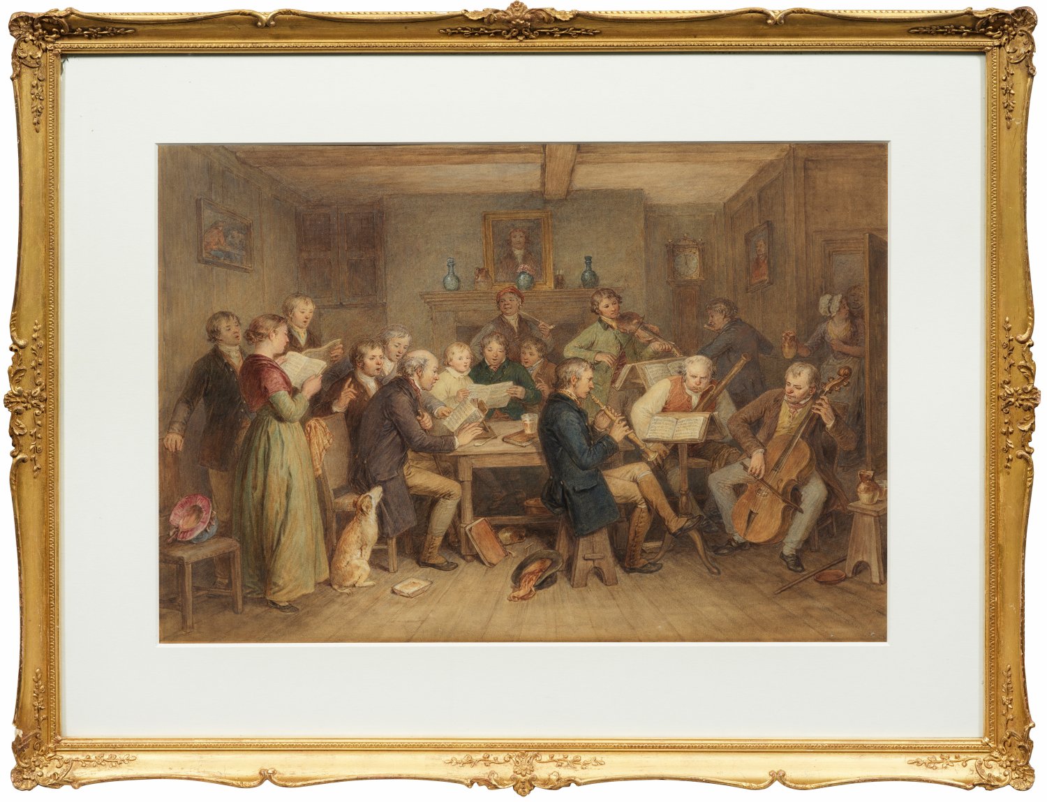 In einem Wohnraum mit Kamin und Bildern an der Wand, hat sich ein Chor aus Sängern und Sängerinnen versammelt, der von Musikern mit Klarinette, Geige, Bass und Oboe begleitet wird. Aquarell und Pastell/Papier, Lichtmaß 44 cm x 61 cm. Rahmen.