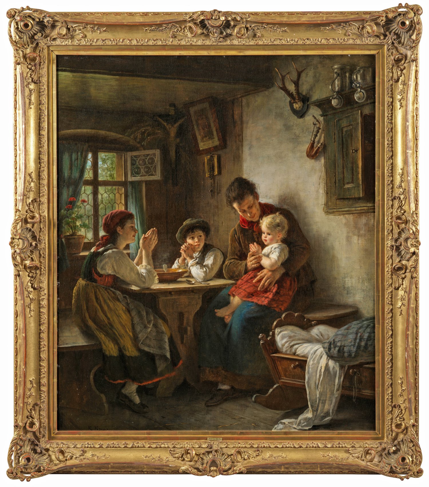 Im Hergottswinkel einer wohl Tiroler Bauernstube unter Heiligenbildern sitzt die Mutter mit drei Kindern am Tisch, auf dem eine gemeinsame Schüssel mit Milchsuppe steht. Es ist der Moment des Morgengebets, zu dem auch das Kleinkind auf dem Schoß der Mutter bereits angeleitet wird. Von links fällt Tageslicht auf die Szenerie, welches in dem sonst dunklen Raum zu reizvollen Hell-Dunkel-Kontrasten führt. Rudolf Epp reiste insbesondere nach Oberbayern, Tirol und in den Schwarzwald, um Motive zum Leben der einfachen frommen Landbevölkerung zu sammeln, welche anschließend die Grundlage seines Oeuvres bildeten. Der Künstler, dessen große Erfolge schon zu Lebzeiten bis nach Amerika ausstrahlten, wird der Münchner Malerschule zugerechnet. Öl/Lwd., doubl.; U. l. sign.; 92 cm x 79 cm. Rahmen.