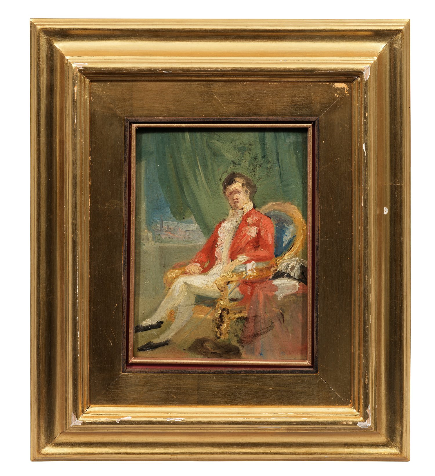 Mit lockerem, breitem Pinselstrich skizzierte, ganzfigurige Bildnisstudie eines Herren in Rokokokostüm, der vor einem schwerem Vorhang halb verdeckten Fenster in einem Fauteuil sitzt und den Betrachter selbstbewusst anblickt. Vito D'Ancona studierte ab 1844 an der Florentiner Akademie bei Guiseppe Bezzuoli. Zusammen mit seinem Künstlerfreund Serafino de Tivoli malte er Landschaften en plein air, war aber überwiegend als Porträtmaler tätig. D'Ancona verkehrte in den Künstlerkreisen des Caffè Michelangiolo. Öl/Karton. Verso von fremder Hand betitelt sowie auf div. Etiketten bez.; 23,5 cm x 17,8 cm. Rahmen.