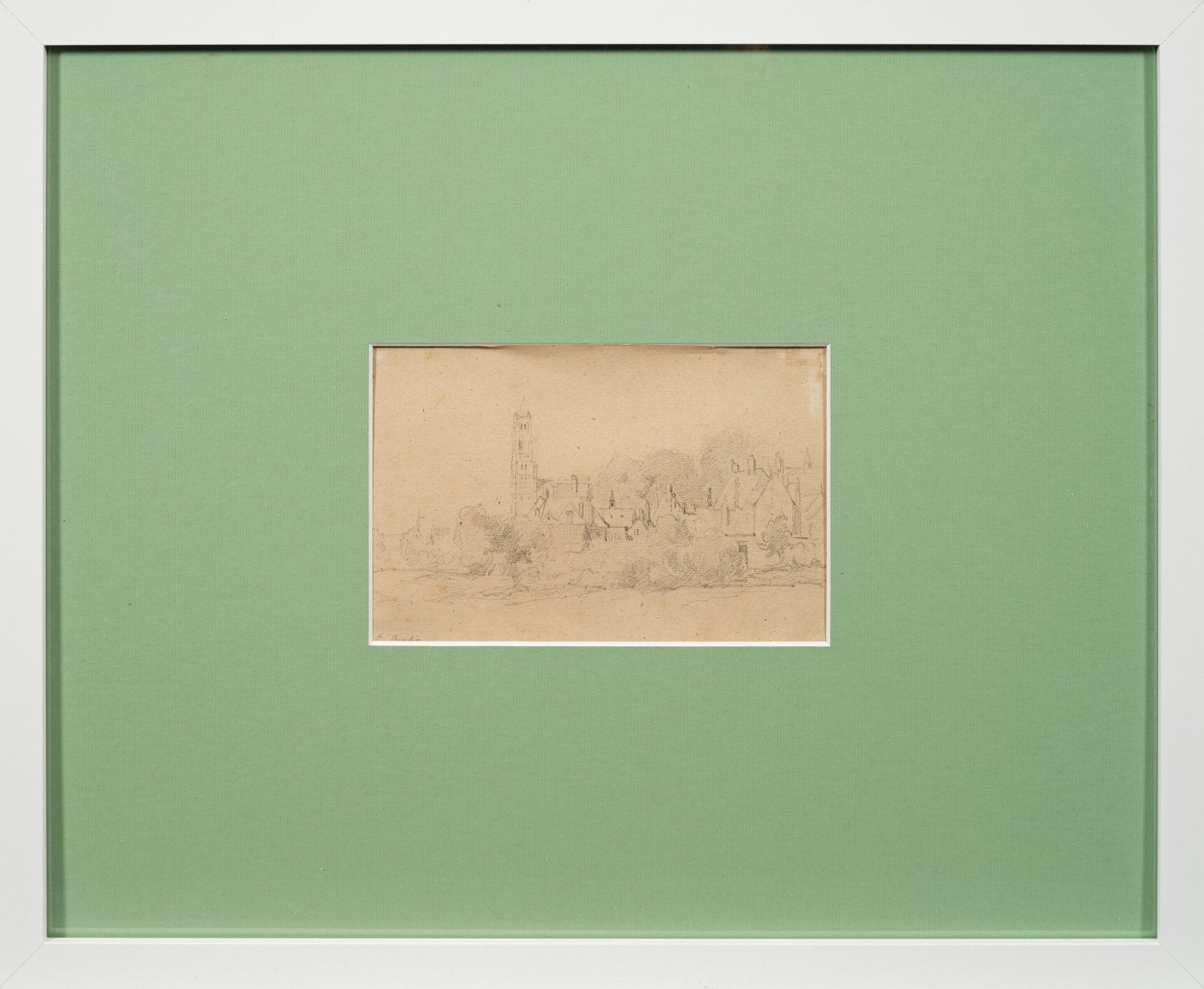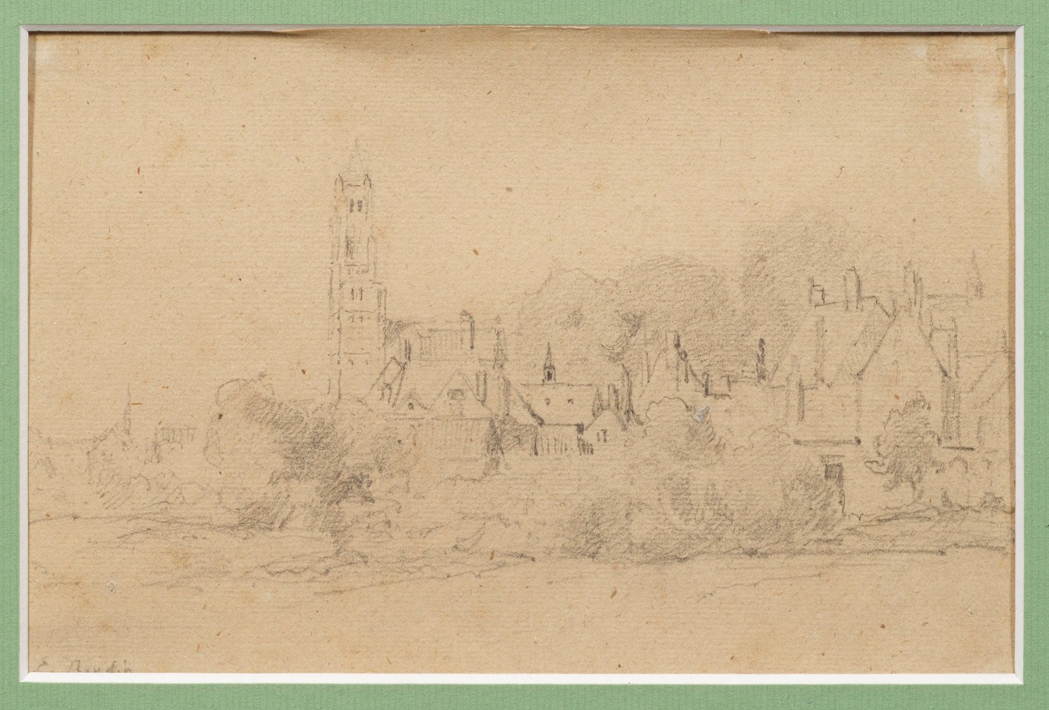 Mit wenigen, wohl gesetzten Strichen erfasste Panoramaansicht mit weithin sichtbarer gotischer Kirche mit hohem, schlankem Glockenturm. Hinter Weiden, die auf einen Flußlauf deuten, nordfranzösische Kleinstadthäuser mit ihren markanten, ungezählten Schornsteinen. Aus einer normannischen Seefahrerfamilie in Honfleur stammend, entwickelte sich Boudin zu einem der wichtigsten impressionistischen Freilichtmaler und Schilderer der Küstenregion an der Mündung der Seine. Bleistift/Papier. L. u. sign.; Rückseitig Angaben des Vorbesitzers zur Provenienz und Darstellung. Ger. stockfleckig, rest.; 13 cm x 20 cm.
