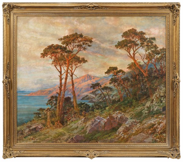 Atmosphärisch eindringliche Darstellung eines in voller Abendsonne leuchtenden, mit Kiefern bestandenen Felsabhangs über einer mit Hängen gesäumten Meeresküste. Die ins eindrucksvolle Großformat gesetzte Fortführung des spätromantischen Geistes der Düsseldorfer Malerschule ins ausgehende 19. Jh., ist ein typisches Werk des Malers. Bereits während des Studiums an der Kunstschule Karlsruhe bei den ehemaligen Düsseldorfern Hans Fredrik Gude und Carl Friedrich Lessing lernte er den Stil kennen. Auf Reisen nach Italien und Kroatien fand er Inspiration zu zahlreichen seiner Werke. Vorliegende Arbeit läßt sich vermutlich eher dem kroatischen Mittelmeer zuordnen. Öl/Lwd. R. u. sign. u. undeutlich dat. (1899?). 140 cm x 170 cm. Rahmen.