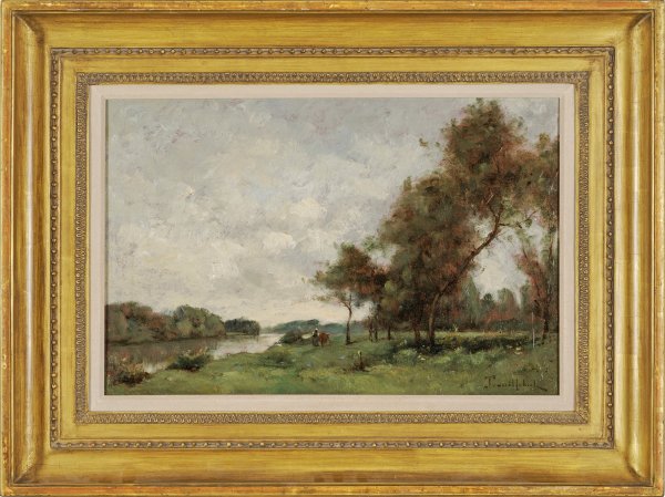 Französische Flusslandschaft mit tief gelegenem Horizont und virtuoser Wolkenbildung. Der durch die sommerliche Landschaft fließende, links von Weiden gesäumte Fluss, reflektiert das tonale Lichtspiel des Wolkenhimmels und der Weiden. Am anderen Ufer schlängelt sich ein Weg, der von einer Frau mit Haube und einem Rind genutzt wird und die in der großen, weiten Landschaft beinahe verloren wirken. Die Farbpalette ist nuanciert und verleiht der an sich banalen Landschaft eine ästhetische Malqualität. Trouillebert wandte sich ab Ende der 1860er Jahre der Plein air-Malerei zu und schloss sich den Malern der Schule von Barbizon um Camille Corot an und malte wie dieser mit silbrig-grauen Farbtönen das hingetupfte Laub der Bäume. Ab 1869 nahm Trouillebert mit Fontainebleau-Motiven und Flusslandschaften von Loire und Oise am Pariser Salon teil, die das Interesse von Sammlern weckten. Öl/Lwd. R. u. sign. ca. 27 cm x 40,5 cm. Rahmen.