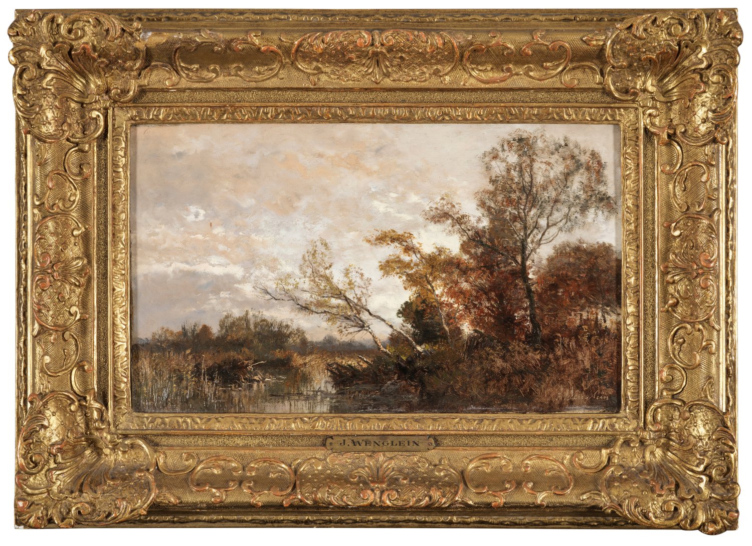 Detailreich geschilderte Moorlandschaft mit gräserbewachsenem Wassergraben, Birken und Weiden. Charakteristische Stimmungslandschaft Wengleins, der an der Münchner Akademie bei Johann Gottfried Steffen und Adolf Lier studierte. Er gehörte neben Ludwig Willroider zu den letzten Hauptvertretern der Münchener Landschaftsschule des 19. Jhs.; Besonders seine Werke aus der Tölzer Zeit spiegeln seine präzise Naturbeobachtung wider. Öl/Lwd.; R. u. sign. Verso dat. 1901. 22,4 cm x 38 cm. Rahmen.