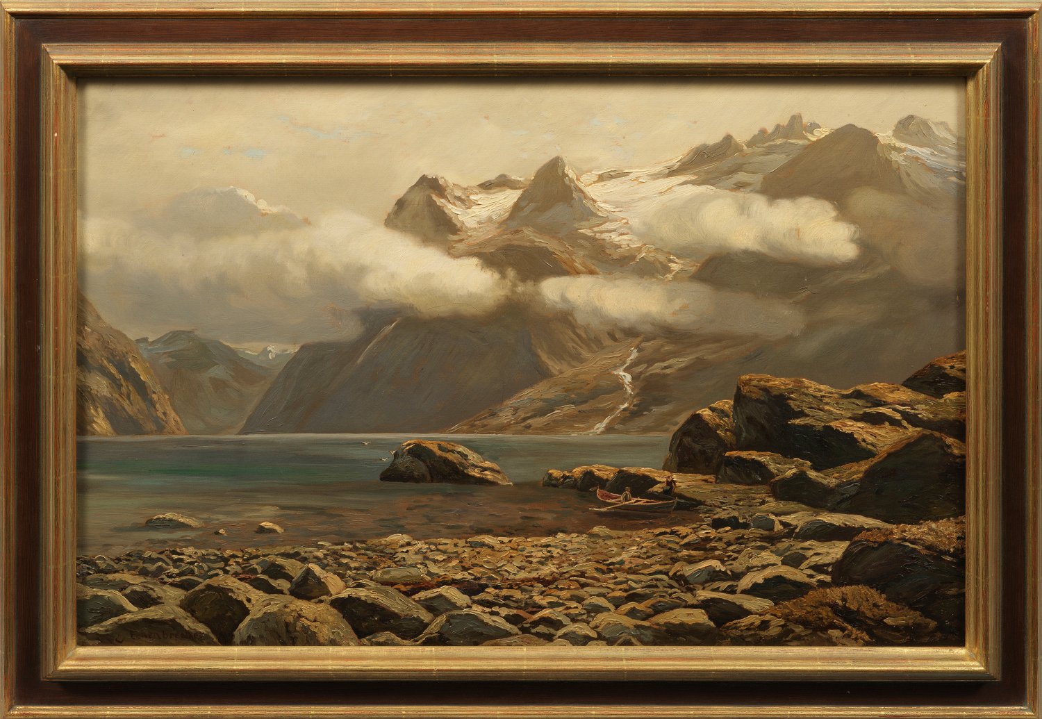 Eindrucksvolle, atmosphärische Schilderung eines schroffen, felsigen Fjordes mit glasklarem Wasser, dessen beeindruckende Natur kaum merklich von einem Ruderboot mit zwei Personen am Ufer gebrochen wird. Charakteristisches Werk Eckenbrechers, der seinem einflussreichen Lehrer Oswald Achenbach besonders in den Lichteffekten folgte. Auf vielen weiten Reisen, u. a. nach Ägypten, Griechenland, Italien, England, Türkei und Norwegen, entstand eine Fülle von Studien und Gemälden. Öl/Lwd., doubliert; L. u. sign.; 63,2 cm x 93,5 cm. Rahmen.