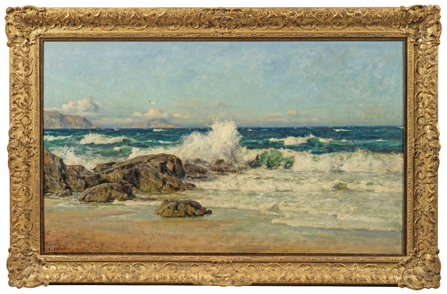 Das breitformatige Landschaftsgemälde zeigt die zerklüftete, von Sandstränden unterbrochene, nördliche Küste Cornwalls an einem beinahe wolkenlosen Tag. Die Wogen des tiefblauen Atlantiks, die in Strandnähe jadefarben changieren, schmettern in ihrem gleichmäßigen Takt tosend gegen Felsenbrocken. Die Horizontlinie ist wie eine gerade Linie durchs Bild gezogen und gibt eine klare Trennung von Himmel und See an. Sie deutet auf den Einfluss von Prof. Eugen Dücker, den Enfield während seiner Jahre in Düsseldorf 1884-1896 kennenlernte. Der Malstil des Briten ist geradezu fotorealistisch und versetzt den Betrachter quasi ins Bild, indem er das anlandende Wasser bis fast an den unteren Bildrand steigen lässt. Später zog es ihn nach Berlin, wo er mit Küsten- und Fjordlandschaften 1895-1914 an den Großen Berliner Kunstausstellungen teilnahm. Öl/Lwd., doubliert.; L. u. sign.; 69,5 cm x 115,5 cm. Rahmen.