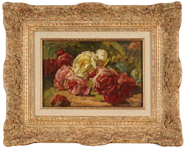 Virtuos gemaltes, impressionistisches Stillleben in duftig frischem Kolorit. Jeannin gehört zu den bedeutenden Blumenmalern der französischen Belle Epoque. Ab 1868 stellte er regelmäßig im Pariser Salon Blumen- und Früchtestillleben aus; 1903 wurde er zum Ritter der Ehrenlegion ernannt und war auf den Weltausstellungen von 1889 und 1900 in Paris vertreten. Seine Werke befinden sich in bedeutenden französischen Museen wie dem Musée d'Orsay in Paris. Öl/Karton. R. u. sign.; Verso Galerieetikett des Kunsthauses Bühler, Stuttgart. 22 cm x 31 cm. Rahmen.