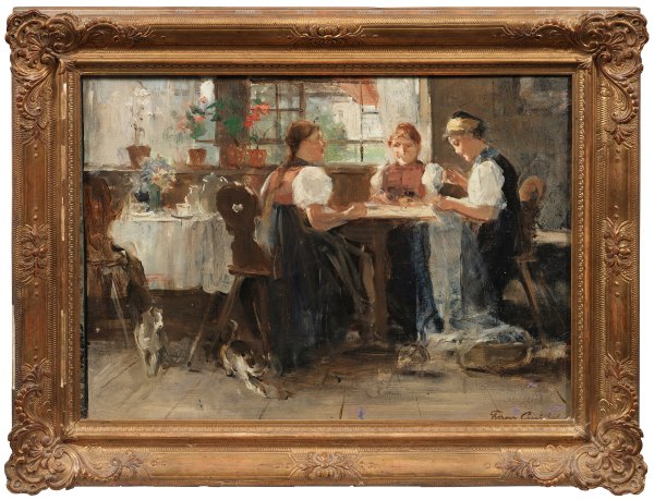 Drei junge Frauen in einer Stube am Tisch sitzend, sie können Schwestern oder Freundinnen sein, sind mit Handarbeiten beim Nähen eines Hochzeitskleids beschäftigt, welches wohl für eine der drei bestimmt ist. Schnell und sicher gemalte, dabei das wesentliche des Interieurs und der Relation der Figuren erfassende Studie zu dem Gemälde gleichen Titels, das Gräßel 1888 auf der Münchner Jubiläums-Kunstausstellung zeigte und das im Begleitbuch von Ludwig Pietsch (bei Hanfstaengl, S. 95-96) einfühlsam besprochen wurde. Gräßel wuchs im Schwarzwald auf und besuchte die Kunstschule Karlsruhe, so zeigt das Gemälde hier noch eines der vom Schwarzwald inspirierten Genremotive im Frühwerk des Künstlers, der später nach München ging und sich der Tier- bzw. Entenmalerei zuwandte. Öl/Papier oder Karton, auf Platte kaschiert. R. u. sign.; Minim. Farbablösung r. u. Ca. 35 cm x 46 cm. Rahmen.