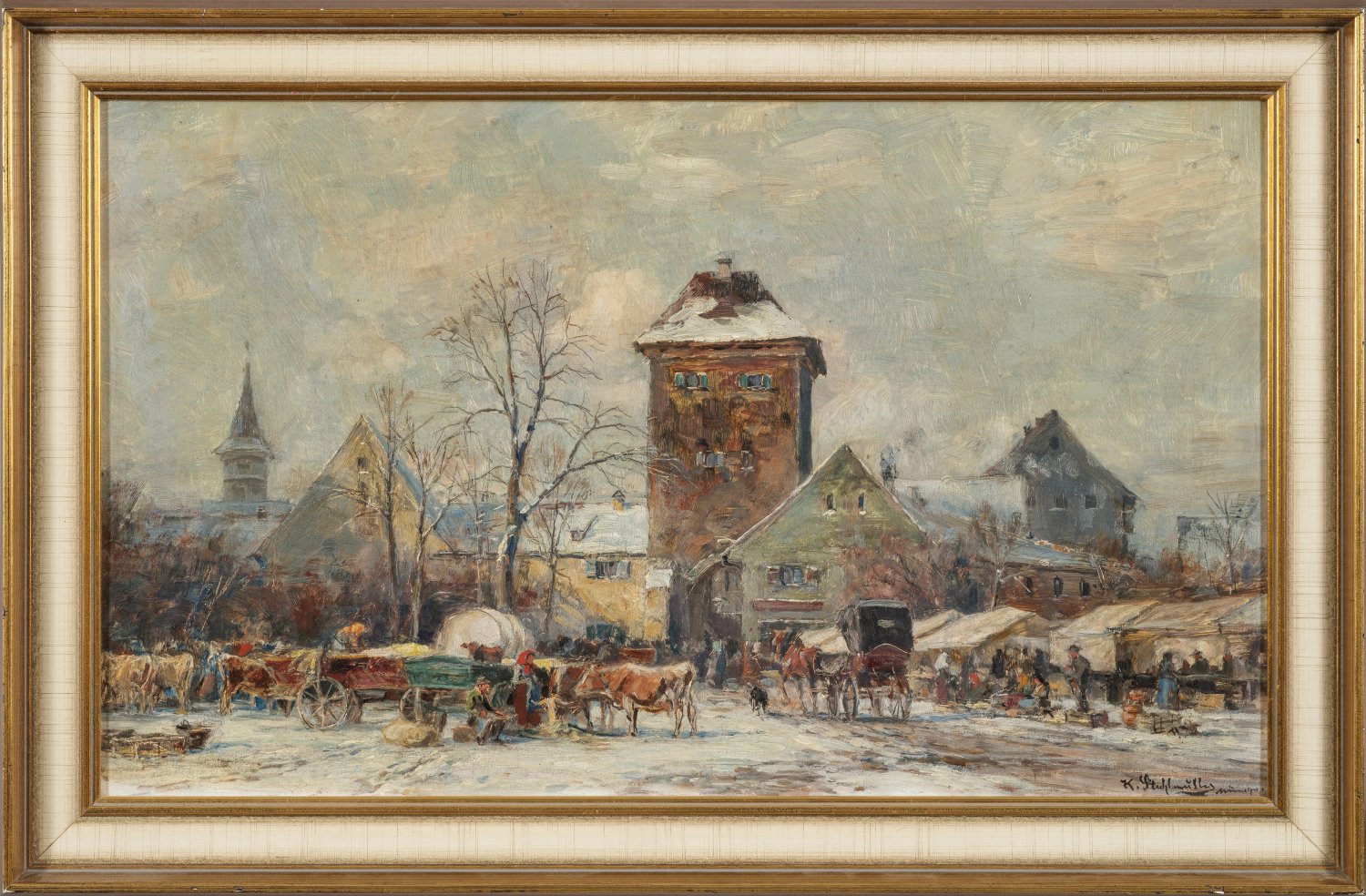 Winterliche Ansicht eines Städtchens mit Kirchturm zwischen verschneiten Hausdächern, im Vordergrund weiter Platz mit Viehmarkt und Gemüsebauern, die ihre Waren feilbieten, teilweise an Ständen mit Planen. Dazwischen Planwagen und eine zum Stadttor fahrende Kalesche begleitet von einem Hund. Typisches, im impressionistischen Malstil gehaltenes Genrebild Stuhlmüllers. Öl/Holz. R. u. sign. mit Ortsangabe München. 34,5 cm x 56 cm. Rahmen.