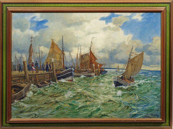 Unter einem tiefgezogenen, sich ins Blaue öffnenden Wolkenhimmel, erstreckt sich bis in die Bildmitte eine langgezogene Kaimauer mit sichtlich schaukelnden Holzschiffen mit bunten Leinensegeln. Die jadefarbene, kabbelige Nordsee bildet Schaumkronen und ein Segler kommt mit voller Fahrt dem Betrachter gefährlich entgegengesaust. Fischer stehen in kleinen Gruppen zusammen und der Rock einer Dame droht, von einer Windböe erfasst zu werden. Der Altonaer Künstler hatte an den Akademien von Düsseldorf und Karlsruhe studiert und sich als Schüler an die zu seiner Zeit bedeutendsten Landschaftsmaler gewandt, um von ihnen zu lernen, darunter Eugen Dücker, Hans Frederick Gude und Ernst Hildebrand. Später reiste er mit seinen Künstlerfreunden Schönleber und Baisch auf der Suche nach Landschaftsmotiven durch verschiedene Länder. 1891 wurde er vom Großherzog von Baden zum Professor ernannt. Öl/Rupfen. R. u. sign.; 90 cm x 120 cm. Rahmen.