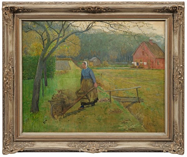 Über einen Feldweg mit Graben schiebt eine Frau mit Haube und Holzschuhen eine Schubkarre mit Kartoffelsäcken. Vor ihrem kleinen Wohnhaus aus roten Klinkern flattert die Wäsche im Wind. Eitner zeigt eine norddeutsche Landschaft in kräftigem und pastelltonigem Kolorit, die etwa um 1910 entstanden sein könnte.