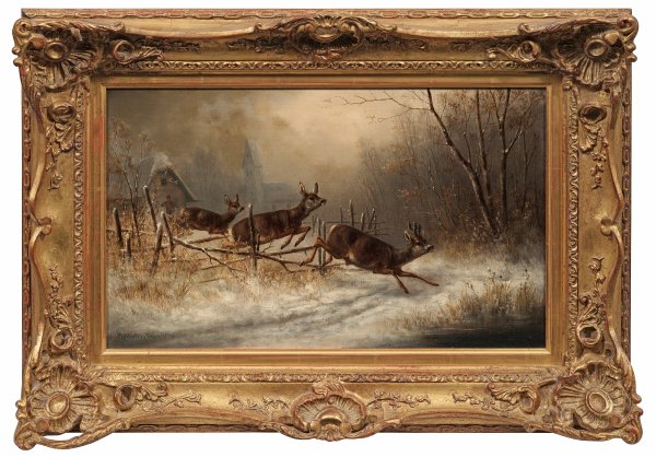 Am Rande eines verschneiten Kirchdorfes vor einem Jäger flüchtendes Rudel. Der Wild- und Jagdmaler Moritz Müller, dessen Großvater Carl Friedrich Moritz Müller (gen. Feuermüller) war, lernte bei seinem gleichnamigen Vater (1841 - 1899) und setzte dessen Tradition fort. Mit Erfolg malte er naturalistisch einheimische Wildtiere und lebendig geschilderte Jagdszenen, die auch als Farb-Postkarten populär waren. Öl/Lwd.; L. u. sign. mit Ortsangabe München. Verso auf Original-Etikett bez. u. betitelt. 28 cm x 45 cm. Rahmen.
