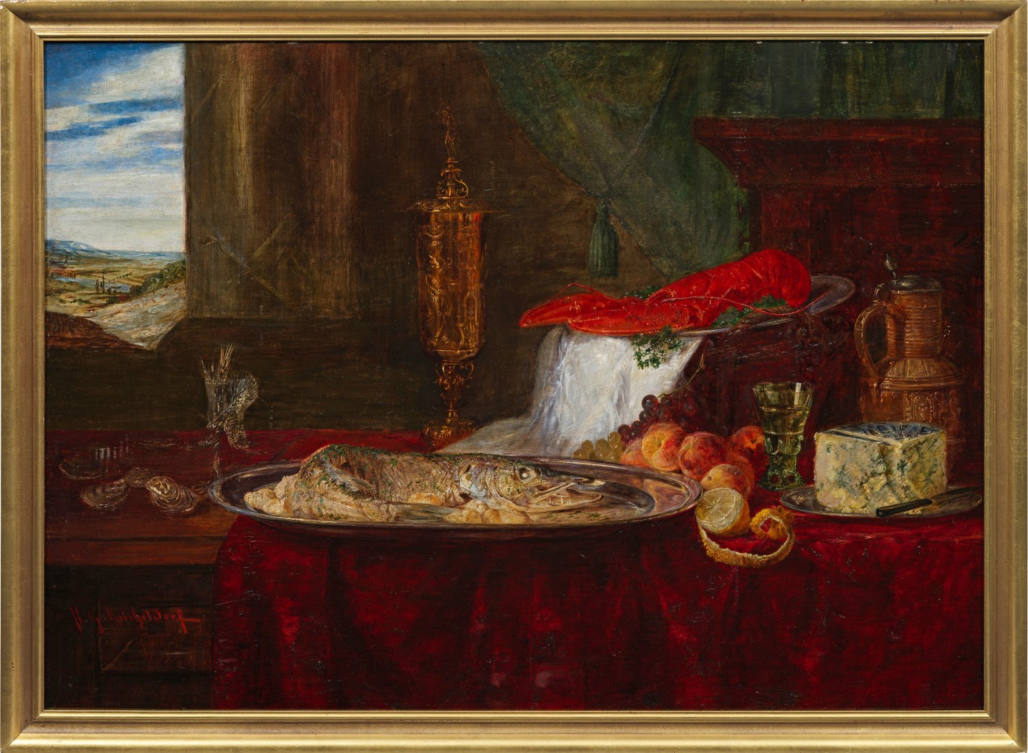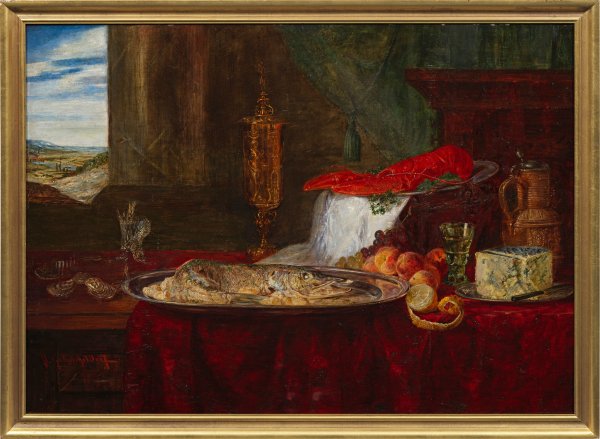 Auf einer tizianroten Samtdecke stehen Silberteller mit gekochtem Hecht und Blauschimmelkäse, daneben Gläser, Pfirsiche, eine Zitrone, Weinkrüge, Pokale und ein leuchtend roter Hummer auf einem Tafelaufsatz. Öl/Mahagonitafel. L. o. sign.; Verso sign. u. dat. 1905 mit Münchener Künstleradresse. 85 cm x 118 cm. Rahmen.