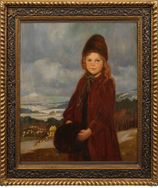 Reizvolles, mit weichem Schmelz gemaltes, einfühlsames Dreiviertelporträt eines blonden Mädchens in einem warmen Mantel mit Pelzmütze und Muff, dem Betrachter mit offenem Ausdruck und leuchtenden Augen freundlich entgegenblickend. Die weite Landschaft im Hintergrund mit bereits eingesetzter Schneeschmelze sind zusammen mit den Weidenkätzchen und gelben Primeln in ihrer Hand erste Frühlingsvorboten. 1910 entstandenes, in Motiv und Stil charakteristisches Werk des Künstlers im Stil der "Jugend". Corneille Max erhielt seine erste künstlerische Ausbildung bei seinem berühmten Vater, dem "Malerfürsten" Gabriel von Max und vollendete sie an der Münchener Kunstakademie bei Gabriel von Hackl und der privaten, modernen Kunstschule von Anton Azbé in München. Ab 1907 stellte er regelmäßig mit Erfolg im Münchener Glaspalast und in der Münchener Künstlergenossenschaft aus. Besonders mit seinen Kinderbildern hatte er großen Erfolg. Öl/Lwd.; L. u. sign. u. dat. (19)10. 93 cm x 81 cm. Dekorativer Prunkrahmen.