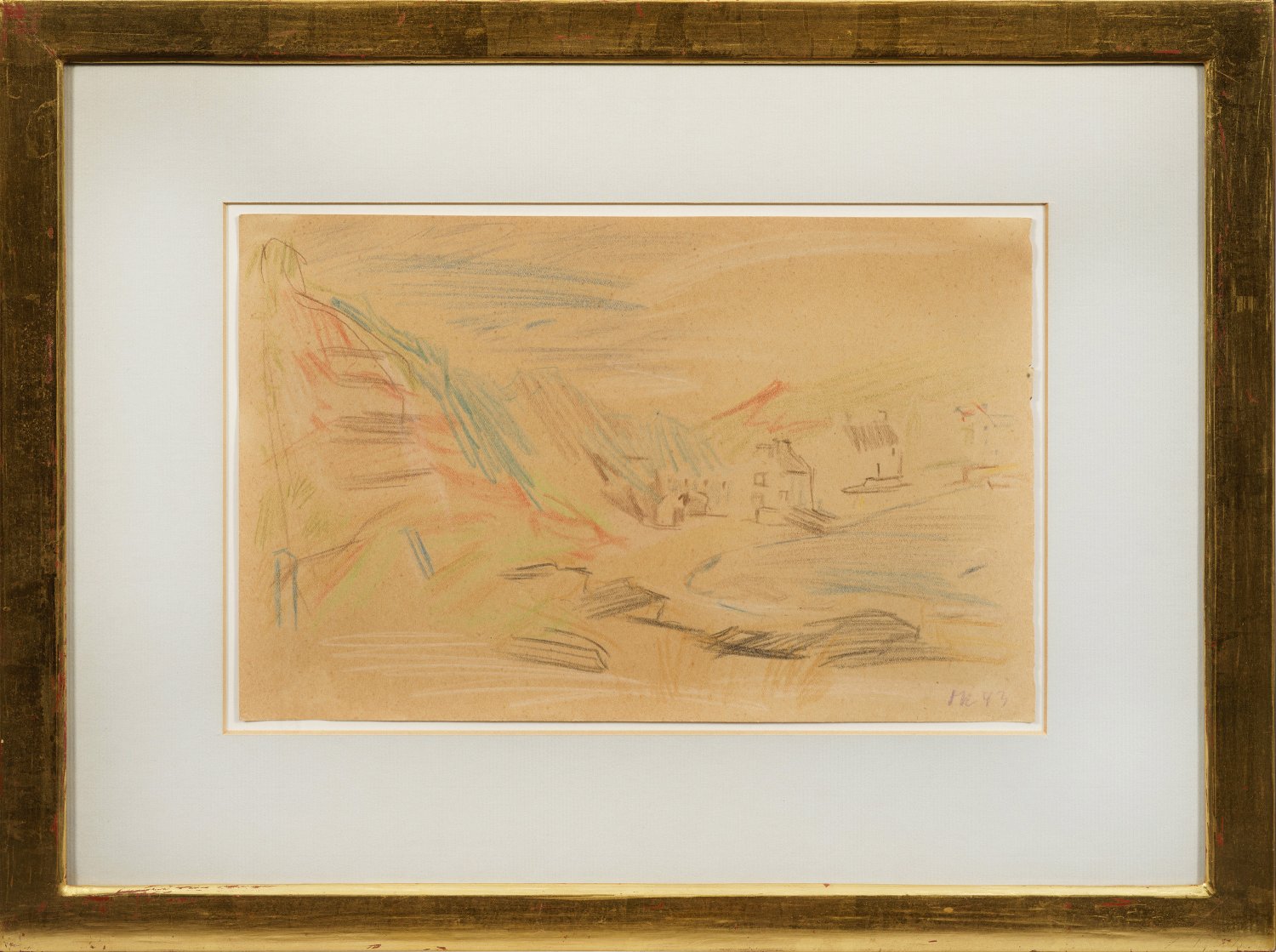 Die mit wenigen kräftigen, sicheren Strichen hingeworfene Farbstiftzeichnung zeigt die kleine Häusergruppe am Strand von Nefyn in Wales und entstand vor dem Motiv. Sie gehört zu einer Gruppe ähnlicher Landschaftszeichnungen, die Kokoschka während eines Aufenthalts in Nefyn (auch Nevin) 1943 im britischen Exil geschaffen hat. Die meisten davon befinden sich im Besitz der Fondation Oskar Kokoschka in Vevey in der Schweiz. Kokoschka gehört zu den Hauptrepräsentanten der Klassischen Moderne. Bereits vor dem Ersten Weltkrieg war er in der Wiener Avantgarde aktiv. Nachdem er verwundet aus dem Krieg zurückgekehrt war, trat er 1919 eine Professur an der Dresdner Kunstakademie an, die er bereits 1924 wieder aufgab, um ein Leben als vagabundierender Künstler anzutreten. Von den Nazis verfemt, lebte er zwischen 1938 und 1946 im britischen Exil, wo er sich abwechselnd in London, Cornwall und Schottland aufhielt. Aus dieser Periode sind zahlreiche Farbstiftzeichnungen erhalten, darunter das vorliegende Blatt. Farbkreide/chamoisfarbenes Papier. R. u. monogr. u. dat (19)43. Gegilbt. 18,8 cm x 27,8 cm. Rahmen.