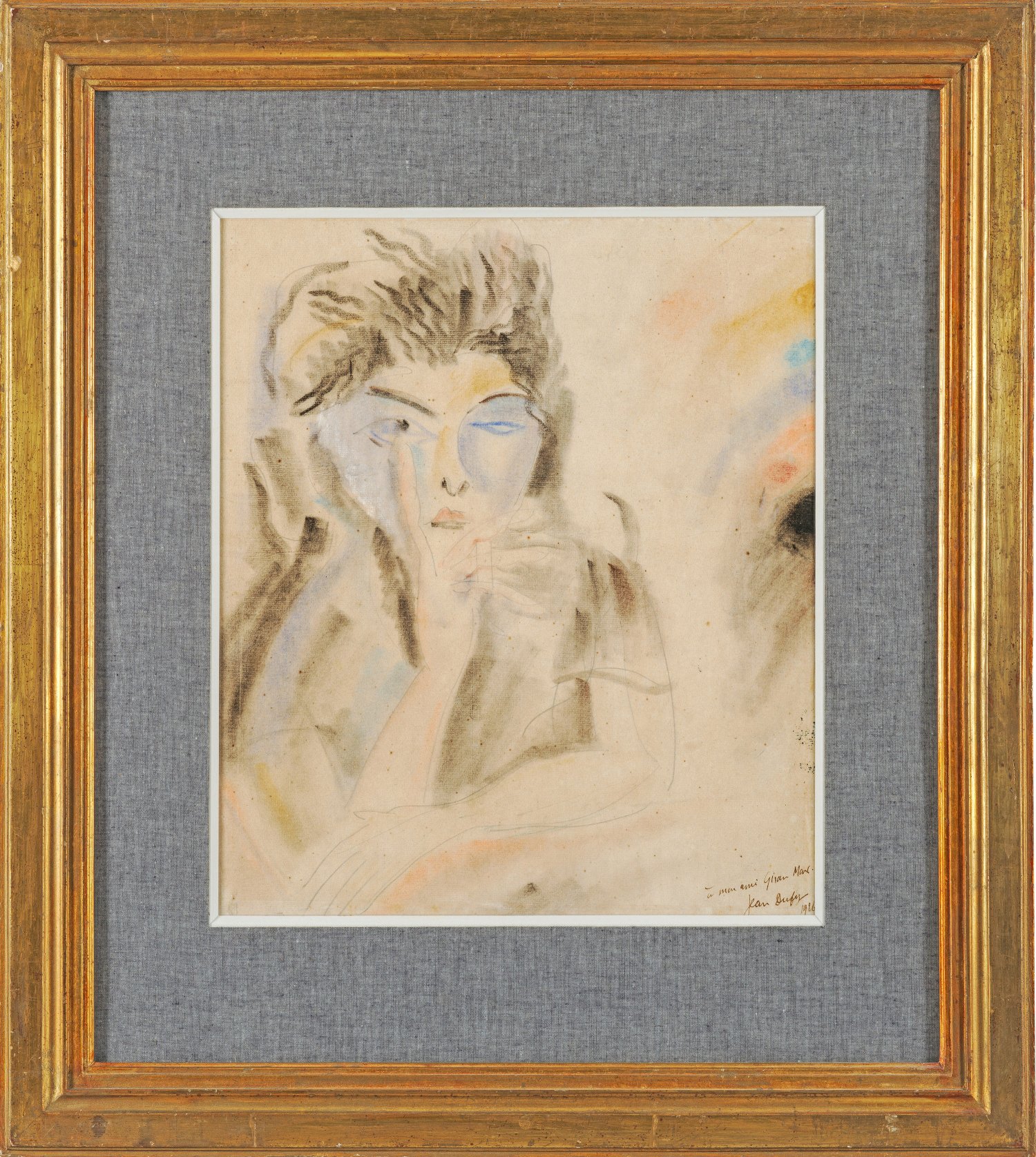 Mit dynamischem Duktus, 1926 geschaffenes, charakteristisches Bildnis Dufys, der wesentlich durch die Fauvisten beeinflusst wurde. Seine Bildsprache zeichnet sich durch einen freien, gestischen Stil mit klaren, leuchtenden Farben und ornamentalen graphischen Elementen aus. Jean Dufy war der jüngere Bruder des bekannten Fauvisten Raoul Dufy (1877 - 1953), was ihn in seinem Entschluss bestärkt haben dürfte, sich nach kaufmännischer Ausbildung und Militärdienst der Malerei zuzuwenden. 1912 zog Jean Dufy nach Paris und begegnete dort rasch André Derain, Georges Braque, Pablo Picasso und dem bedeutenden Dichter und Schriftsteller Guillaume Apollinaire. Bereits 1914 präsentierte Dufy erstmals seine Aquarelle in der "Galerie Berthe Weill" in Paris und fand große Anerkennung, 1920-1938 beteiligte sich Jean Dufy an einer Reihe von Ausstellungen in Paris und New York. 1937 führte er zusammen mit seinem Bruder Raoul ein monumentales Deckenfresko für die Weltausstellung aus. Pastell und Bleistift/bräunliches Papier. R. u. sign. und dat. 1926 sowie mit Widmung "á mon ami Giran Max" (vmtl. Léon Giran-Max, Paris 1867-1927). Verso auf Papieretikett betitelt soiwe mit div. Beschriftungen. Ca. 42 cm x 37 cm. Rahmen.