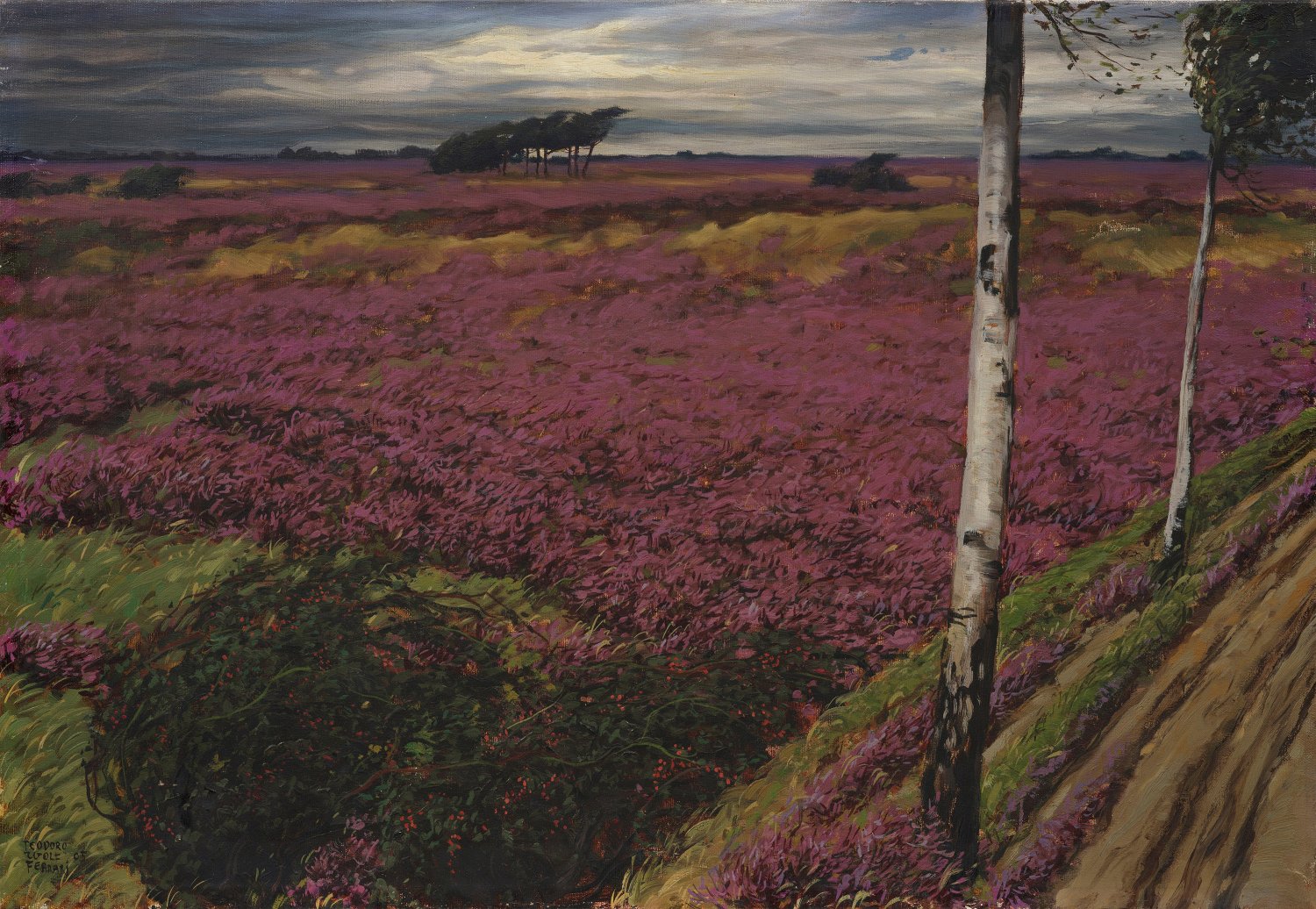Mit dynamischer Pinselführung und atmosphärisch geschildertem Wolkenspiel fängt Wolf-Ferrari hier vortrefflich einen stürmischen Tag in der Lüneburger Heide ein. Herausragende Stimmungslandschaft, die vom charakteristischen, zarten Violettton des Heidekrauts dominiert wird. Wolf-Ferrari, der an der Akademie in Venedig bei Guglielmo Ciardi, Pietro Fragiacomo und Camillo Bortoluzzi ausgebildet wurde, ging 1896 zu Studienzwecken nach München, wo er Bekanntschaft mit Fritz Erler, Leo Putz und weiteren Künstlern der Münchner Secession und der Künstlervereinigung "Die Scholle" machte, die ihn nachhaltig beeinflussten. 1904 hielt sich der italienische Künstler für längere Zeit in der Lüneburger Heide auf und hielt seine unmittelbaren Eindrücke in zahlreichen, reizvollen Landschaften fest, wofür das vorliegende Gemälde ein ausgezeichnetes Beispiel darstellt. Öl/Lwd.; L. u. sign. und dat. (19)05. Verso Etikett des Kunstsalons Aktuaryus, Wiesbaden. Riss. 50 cm x 69 cm.